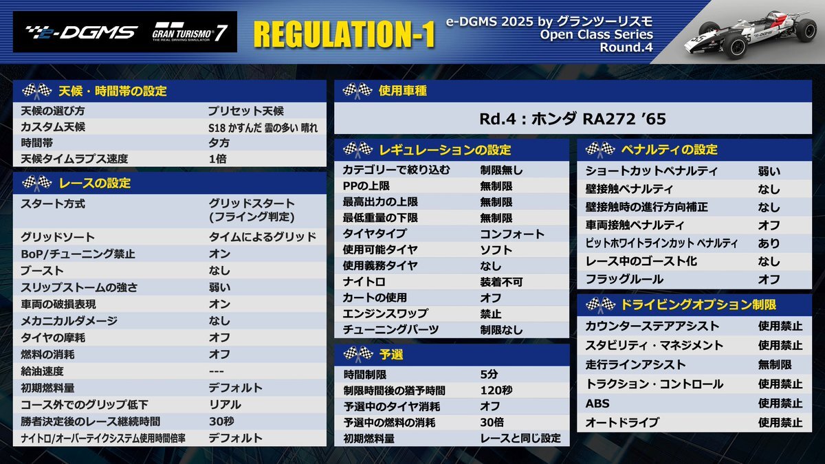 【10月3日 17時よりエントリー開始】 Open Class Series Rd.4 11月2日(日)20:20〜オンライン開催 ● ホンダ RA272 '65 ● モンツァ・サーキット (シケイン無しレイアウト) #eDGMS #GT7 #グランツーリスモ #参加者求む pic.x.com/ZkbjYZDtnc