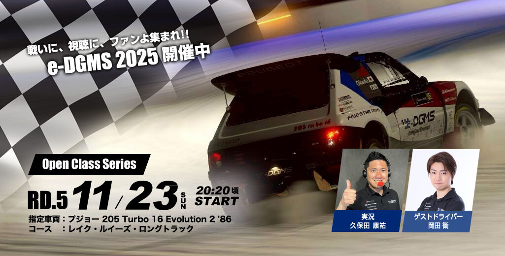 e-DGMS 2025 by グランツーリスモ Open Class Series Round.5【2025年11月23日】 #グランツーリスモ7 のオンライン大会。 国内在住の中学生以上を対象とした「Open Class Series」 Rd.5は11/23(日)20:20~ 配信 #edgms esports-world.jp/tournament/558…