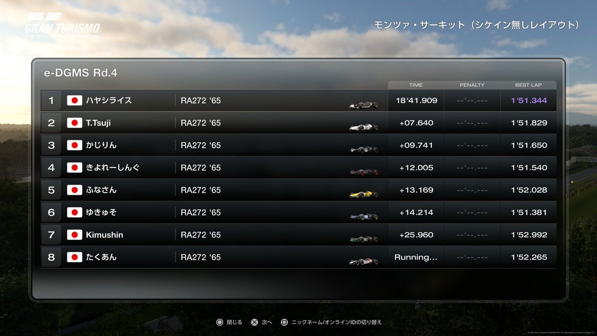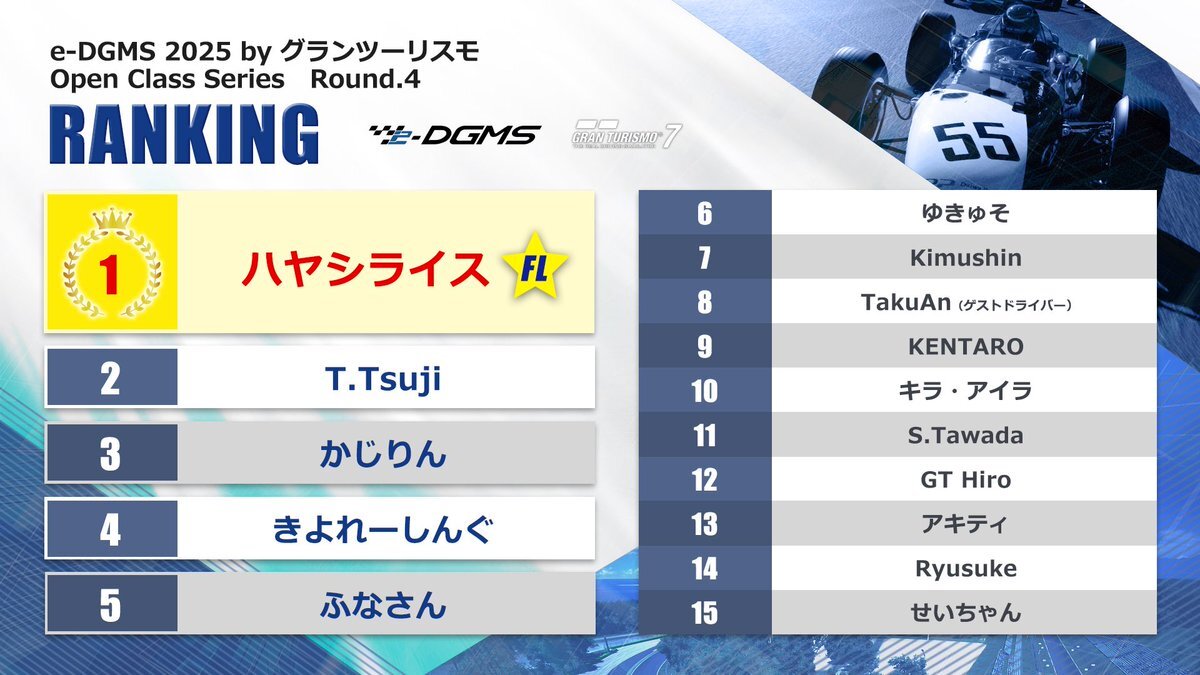 🏁 e-DGMS 2025 by グランツーリスモ Open Class Series Round.4 結果発表! 🥇 ハヤシライス 🥈 T.Tsuji 🥉 かじりん 4️⃣ きよれーしんぐ 5️⃣ ふなさん 優勝おめでとうございます🎉 次戦もお楽しみに! #eDGMS #GT7 #グランツーリスモ #OpenClass pic.x.com/m5Ene7TIAr