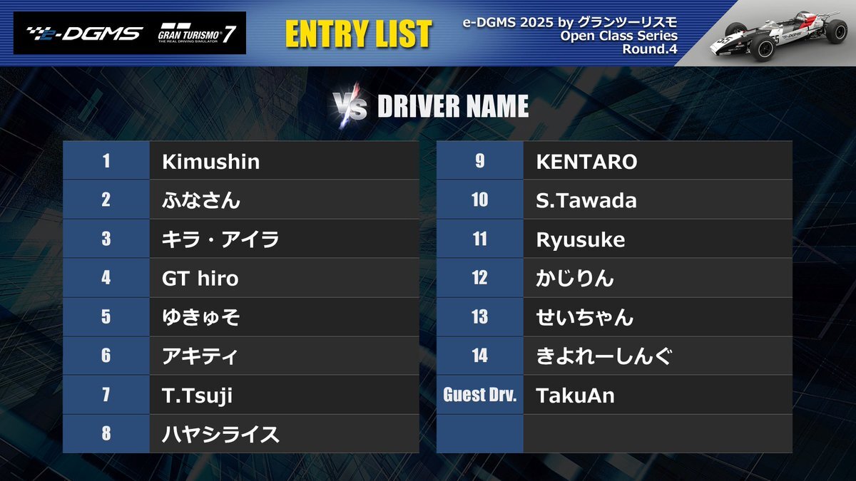 【エントリーリスト公開】 11月2日(日)20:20〜 Open Class Series Rd.4 ゲストプレイヤー #TakuAn 選手 解説 #岡田衛 氏 ホンダRA272’65のワンメイク モンツァ・サーキットのNo. 1は誰になるのか⁉️乞うご期待です😁 参加者の皆さんは、今一度レギュレーションのご確認をお願いします。 #eDGMS pic.x.com/OdV3LWFmuc