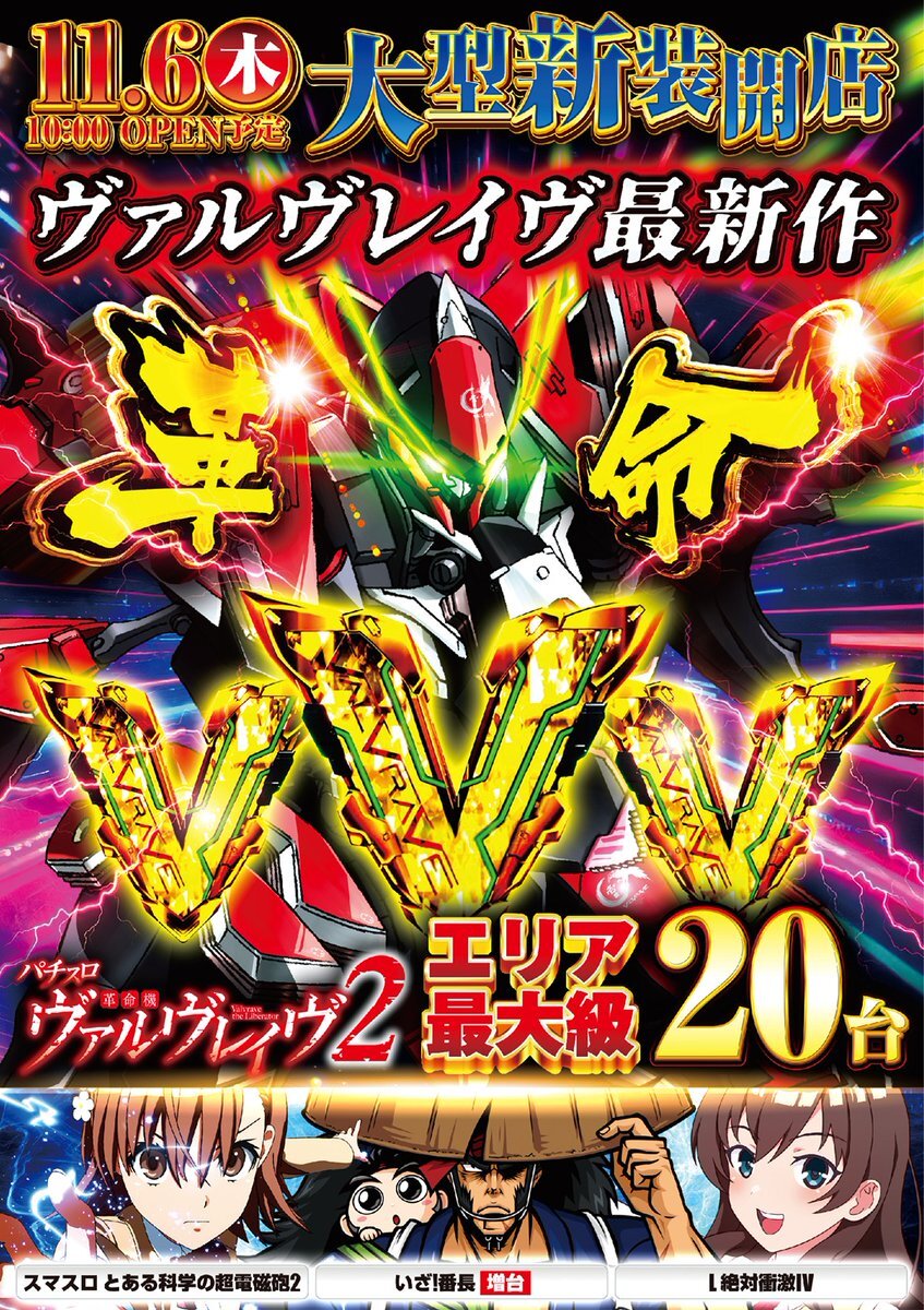 11月6日【木】朝9時開店‼️ 🌟最新台好評稼働中🌟 #Lパチスロ革命機ヴァルヴレイヴ2 #L絶対衝激IV #スマスロとある科学の超電磁砲2 #eFもののがたり #e花の慶次~黄金の一撃 #Pいくさの子戦極最強ドデカ199ver. ワンパチに #東リベ #ブルーロック 登場‼️ ご来店お待ちしております😆 pic.x.com/duY4dxALLo