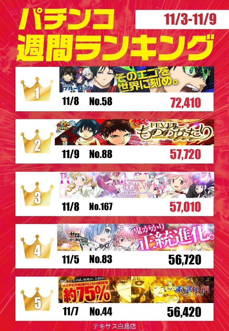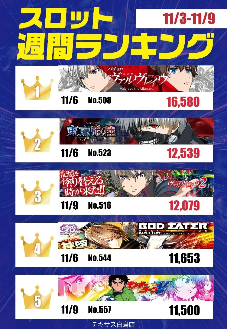 こんにちは😀 テキサス白島店です 1⃣1⃣/3⃣~1⃣1⃣/9⃣週間ランキング 集計完了💪 ご遊技台のご参考にどうぞ👍 ✨最新台✨ #eFもののがたり #Lヴァルヴレイヴ2 ランキング入り🎉 この後も、皆様のご来店をお待ちしております pic.x.com/0w1L7hE3um