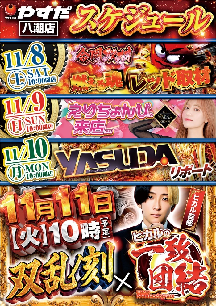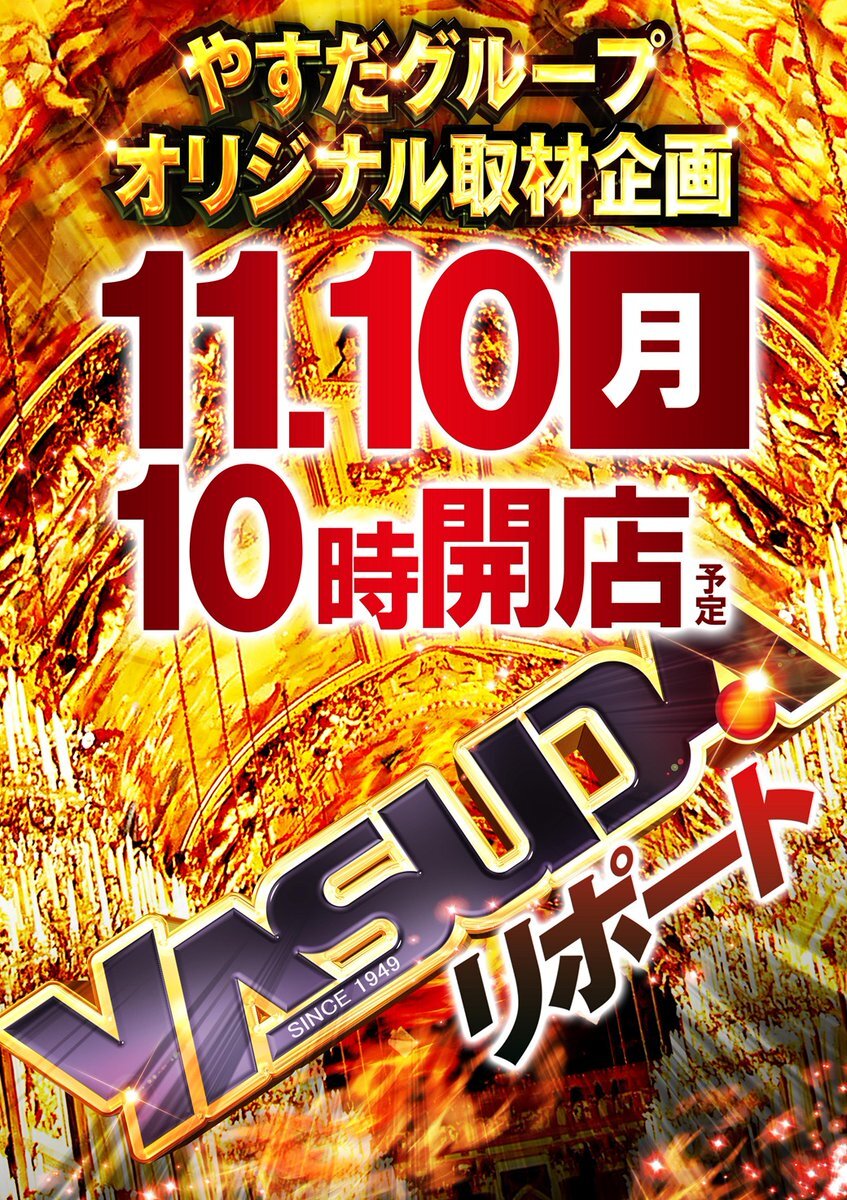 ⚡やすだ八潮店 です⚡️ 11月10(月) 10時OPEN!! #yasudaリポート 開催⚠️ 🆕最新機種🆕 🔥エリア最大級導入済🔥 #パチスロヴァルヴレイヴ2 20台 #いざ番長 ✊漢の増台 10台 #eFもののがたり 15台 #e花の慶次黄金の一撃 8台 今週も💪モリモリで🆙 行かせていただきます!! pic.x.com/6SVDcJjuZu