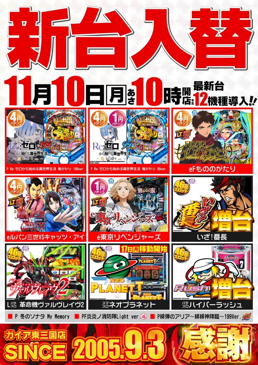 🌈明日11月10日(月)🌈 あさ10時開店予定 ✨新 台 入 替✨ #Pリゼロ鬼がかり 199ver. / 99ver. #eFもののがたり #eルパン三世VSキャッツ・アイ #Lヴァルヴレイヴ2 #Lいざ番長 増台 🚩入場方法のご案内 駅側正面入口にて 9:50 抽選開始 皆様のご来店 お待ちしております!! 💡p-town.dmm.com/shops/osaka/74… pic.x.com/0IX21gRw2c