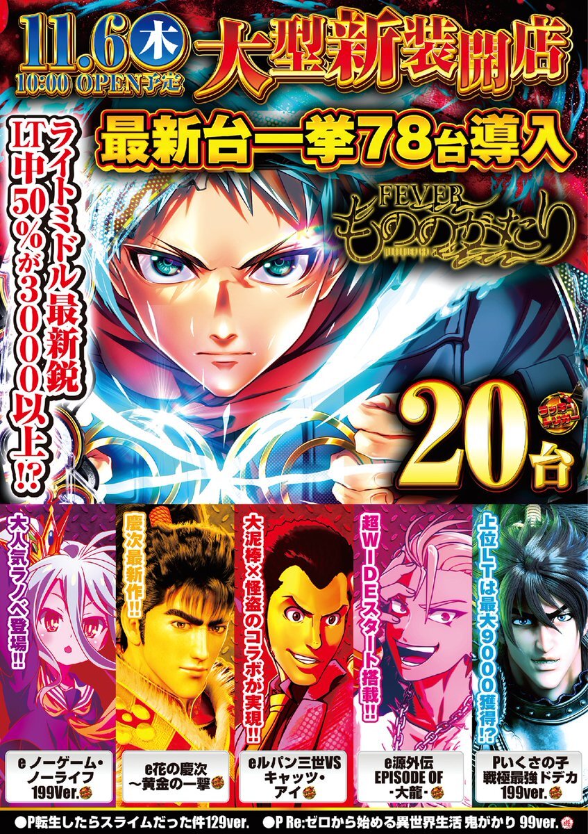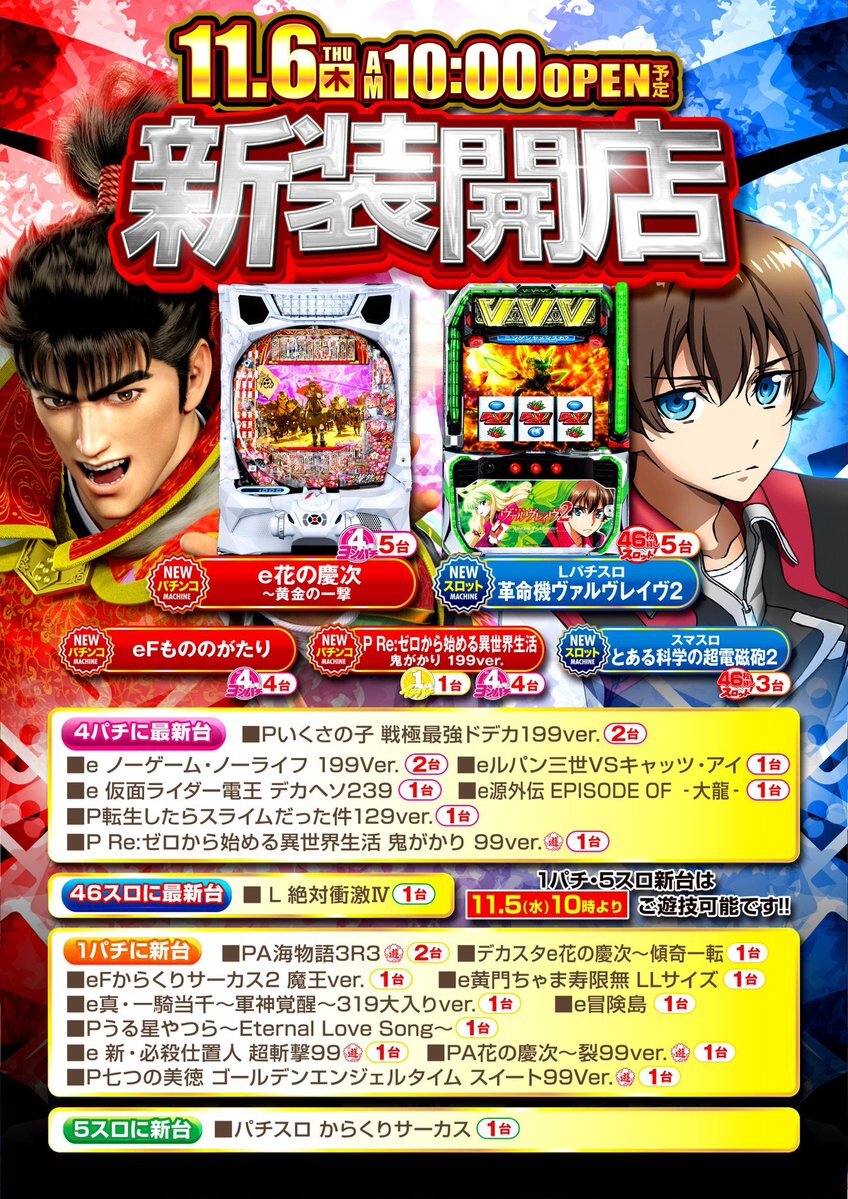 11月6日 新 装 開 店 10時オープン 導入機種 #eFもののがたり #PReゼロから始める異世界生活鬼がかり 99ver. #Lパチスロ革命機ヴァルヴレイヴ2 #L絶対衝激IV #いざ番長 pic.x.com/pStLymAZvl