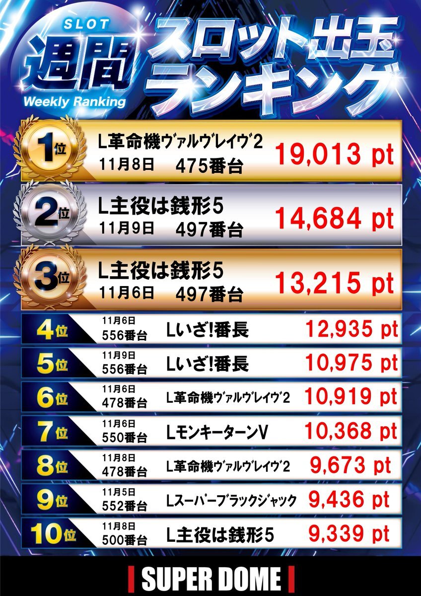 11/3~9 #週間ランキング ▶️パチンコ◀️ 最新機種 #eFもののがたり 1/149の大当り確率とは思えない ポイント数GETで首位に立ちました❗️ 8日土曜日の ランクインが目立ちました 週末楽しめたことは何よりです❤️ ▶️スロット◀️ 最新機種 #L革命機ヴァルヴレイヴ2 堂々 #コンプリート ‼️ #オススメ機種 pic.x.com/i9pNoMKLud
