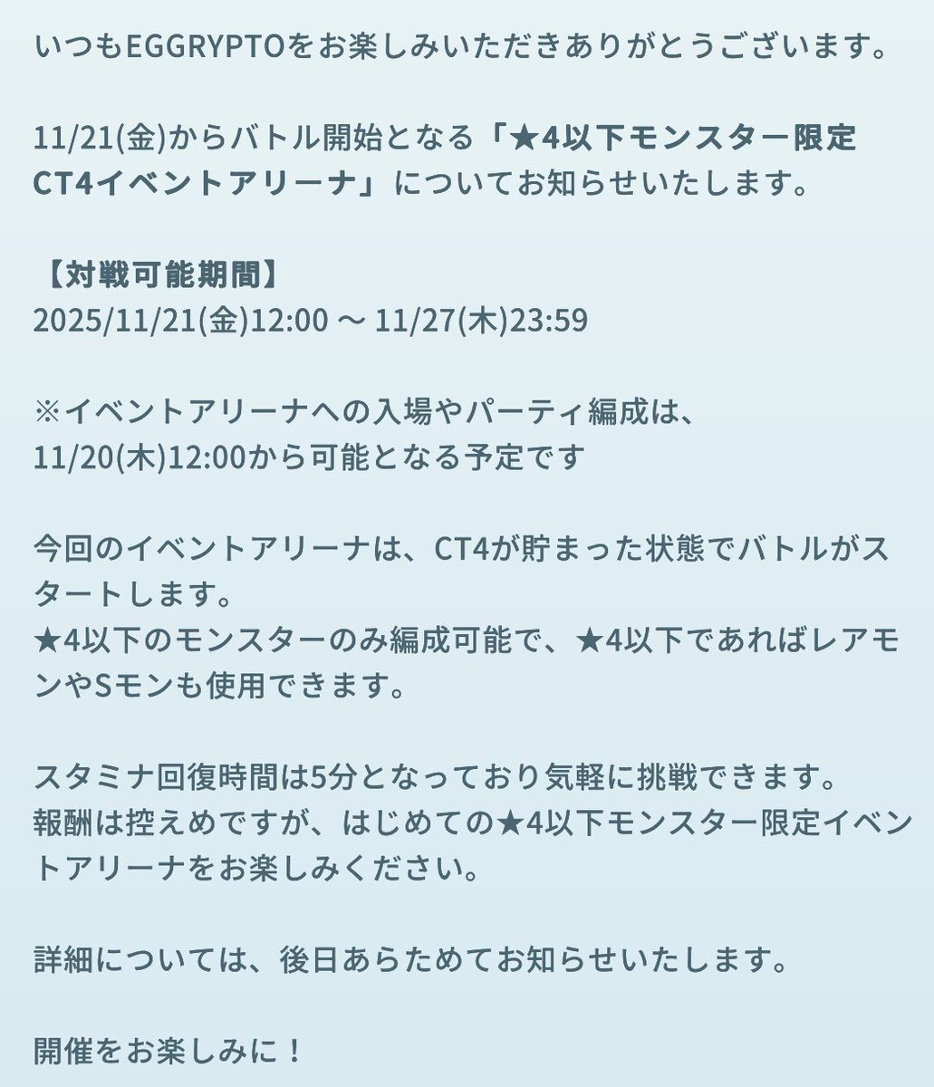 【★4以下モンスター限定CT4イベントアリーナ事前告知】 今回のイベントアリーナは★4以下のモンスターのみ編成可能で、★4以下であればレアモンやSモンも使用できます。 スタミナ回復時間は5分となっており気軽に挑戦できます。 詳細は後日お知らせいたします。 お楽しみに! #eggrypto #エグリプト