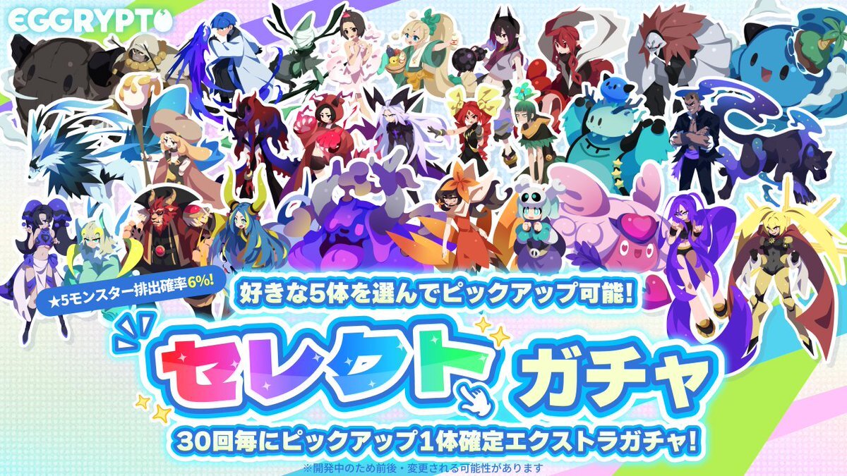 【セレクトガチャ開催告知!】 11/20(木)12:00 ~ 11/30(日)12:00に開催! 対象の中から好きな5体をピックアップできるガチャです! ガチャ30回ごとにピックアップキャラ1体確定のエクストラガチャが可能! 1人1回まで、ピックアップ1体確定の有償スペシャルガチャもできます。 #eggrypto #エグリプト pic.x.com/p3KeuDyNSY
