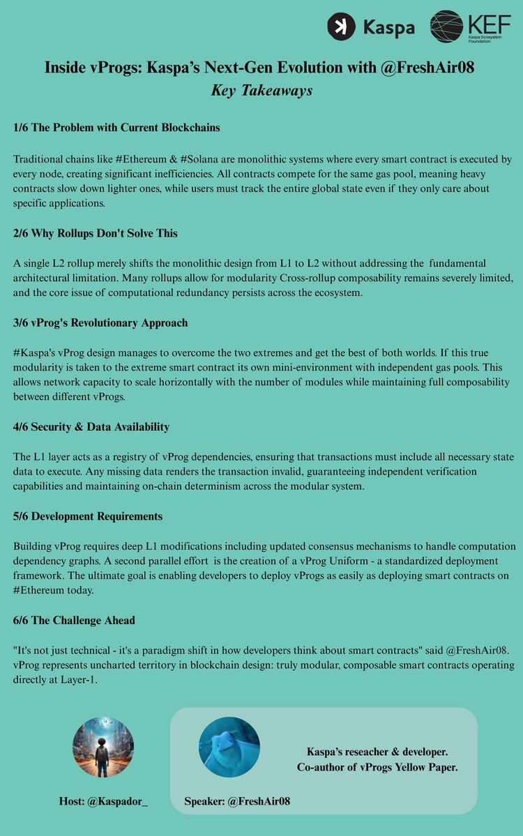We hosted an insightful space with @FreshAir08 a few days ago, diving deep into #Kaspa's vProgs vision and design. For those who missed it, we've prepared a quick recap to share the key insights from the conversation. At the end of the space, @FreshAir08 shared a personal