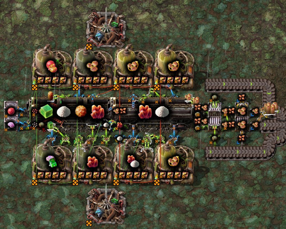 いい加減最初期から使われて規模を増やしただけのグレバのラインを整えたい 手始めにレジェンドバイオチャンバーを300用意した 各種モジュールの量産もされ始めているから、相当コンパクトにしても生産量は確保できると思う #factorio #factoriospaceage