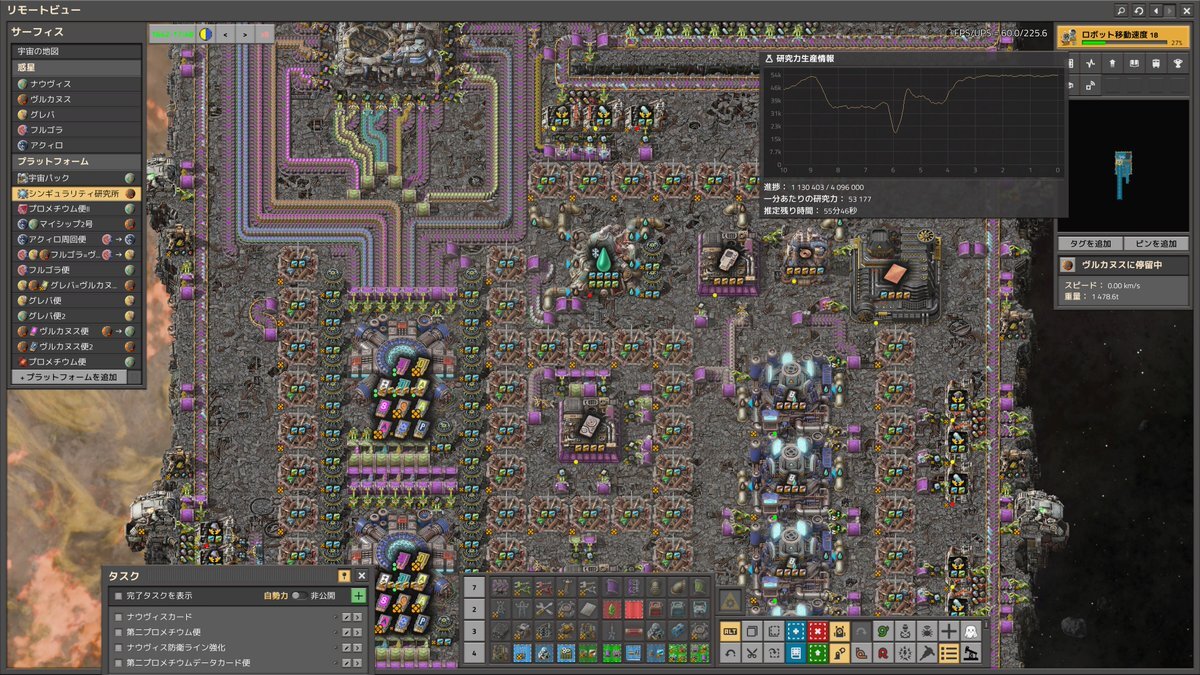#Factorio K2SOで一部のカードはレジェンド量子コンピュータに品質モジュールを挿して試してみたら 最終的にSPMが量子コンピュータx10で4kまでしか上がらなかった。 シンギュラリティ研究所に生産性モジュール詰め込んだら研究力/分が5万まで上がったので無限研究さまさまともいったところ。 pic.x.com/z70N6TJHUg