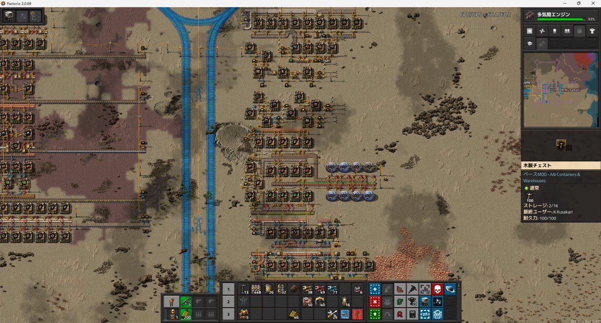 #factorio SEK2 土地狭い問題、いったんメインバスは引かずに箱から素材供給するミニ工場を乱立させ、素材搬入出は工場長がやる形で進めてみることにした。うおォン 俺は人間メインバスで人間物流ロボットだ pic.x.com/Mq9sKkdykV