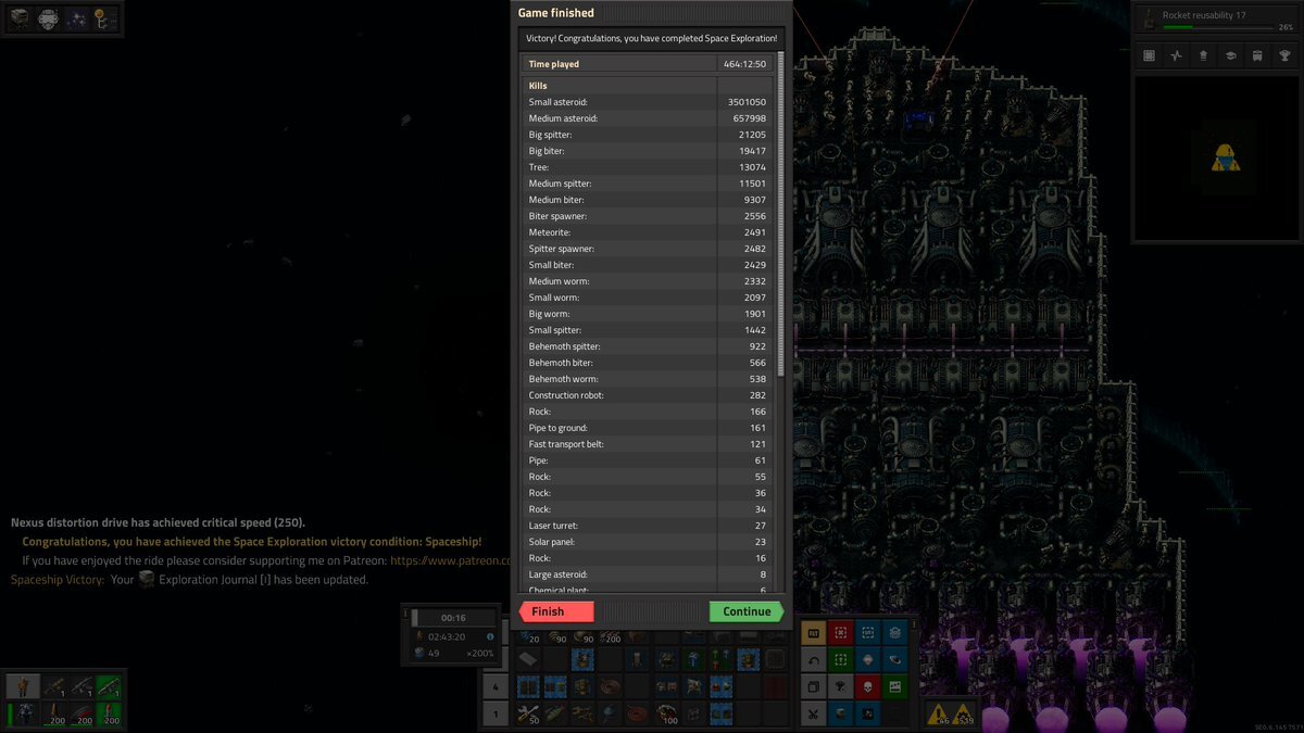 #factorio SE Victory!! 長かった・・・やり直し設計含めたら500時間以上かかりました。 始めたものの最初はモチベ上がらなくて放置した時もあったけど少しづつでも続けることでモチベあがっていってクリアまでこれた。 factorio、改めて神ゲーです。 次は2.1のSAかな、それまではのんびり拡張 pic.x.com/X3gmBRUmM1