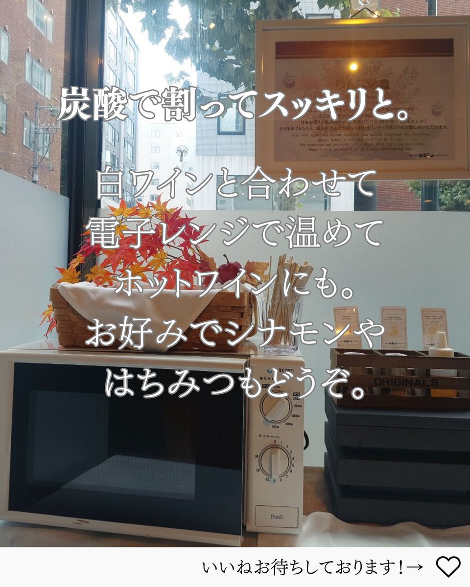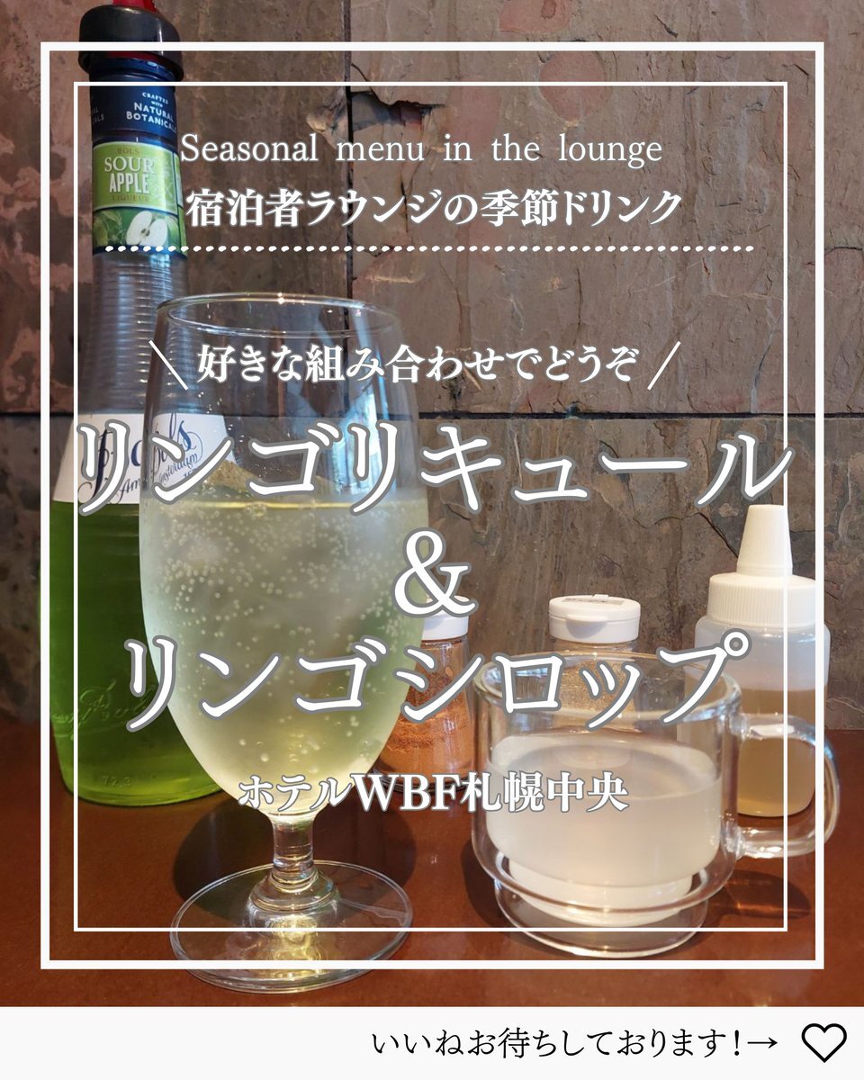 ■ホテルWBF北海道■ 10月~の限定ドリンク、青リンゴリキュール&青リンゴシロップをはじめました🍏 白ワインと合わせて電子レンジでホットワインも作れますよ! 寒くなってきた今日この頃。ラウンジでもあたたまってね。 #ホテルWBF北海道 #札幌 #りんご #ラウンジ #sapporo #apple #fallvibes pic.x.com/1CW5K2C15N
