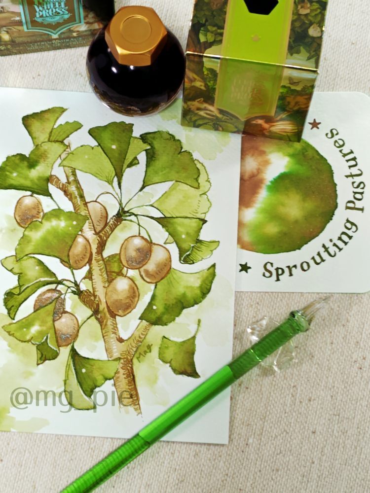 フェリスホイールプレスの「スプラウティング パスチャーズ」(発売中)で銀杏を描きました。 直訳すると「芽吹く牧草」かな?その名の通りそのままさらっとペンを走らせるだけで草や葉がそれっぽく描けます🌱 ブラウンのラメも良いアクセントに✨ #ferriswheelpress #フェリスホイールプレス pic.x.com/Pruaeck28m