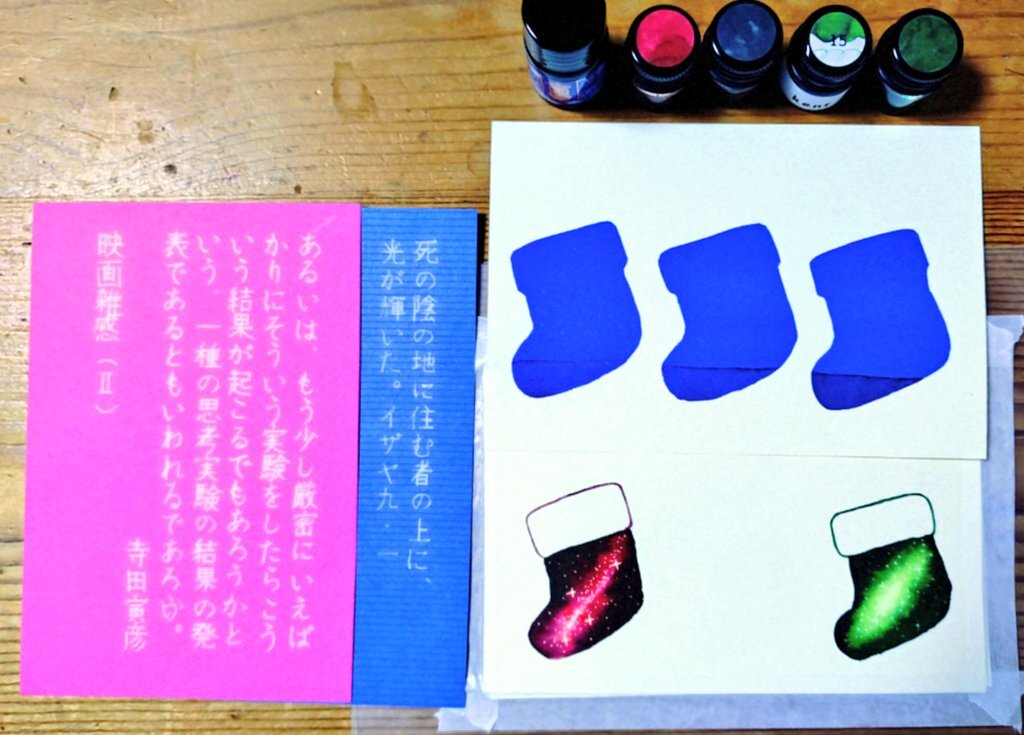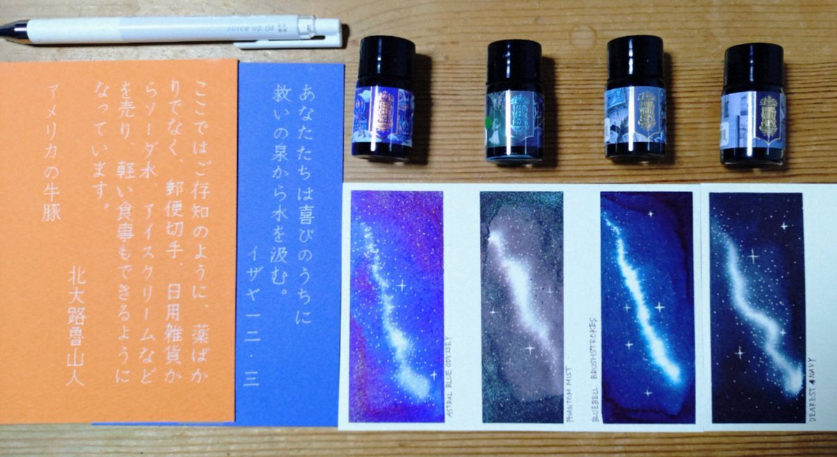 #朝活書写_2196 お題に感謝です。#聖書書写 もしたけど、今日買ったインクの色見本として星空を描いたら、バテました。 #TIPS #FerrisWheelPress 最後のは #PaperTree さんで購入。いろいろ考えてたけど、結局買ったのはこれだけ。 pic.x.com/XpQASlIsvU x.com/asakatsu_shosh…
