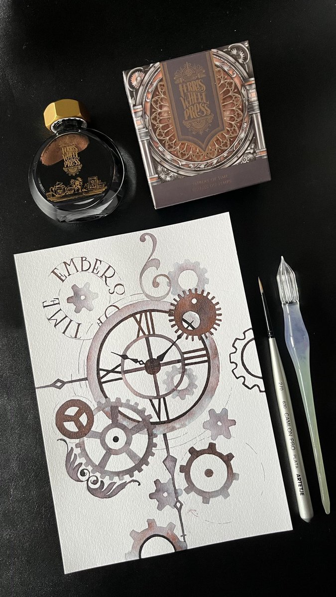 11/7(fri)発売 Ferris Wheel Press の新色インク EMBERS OF TIME 時計と歯車のパッケージのイメージから描いたイラストです⚙️ メンズライクなデザインとカラー🩶🤎 @FWPStationery @FWPStationery #インク #ferriswheelpress pic.x.com/hZuRsB7TpR
