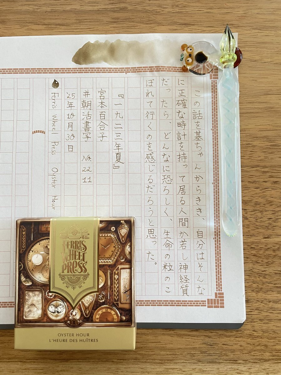 #朝活書写 #朝活書写_2211 お題をありがとうございます♪ 時計モチーフの箱デザインが可愛いかったのでこのインクで🖋️ #Kokeshi #飾り原稿用紙 #FerrisWheelPress #OysterHour pic.x.com/aLm1fK5HtH