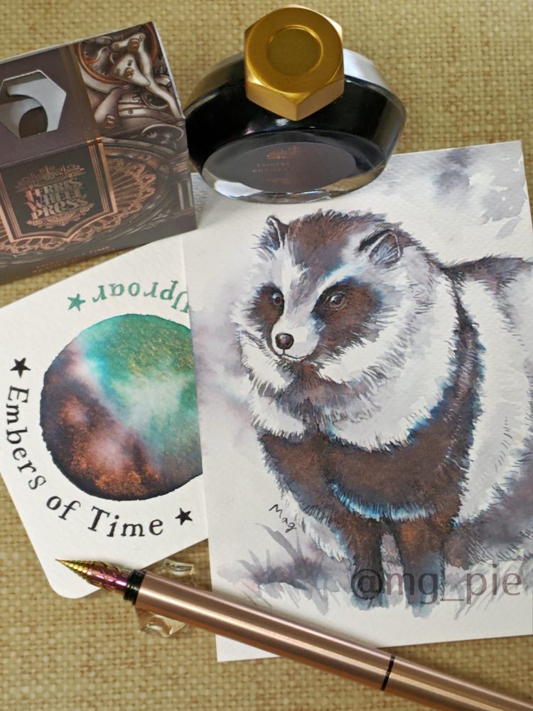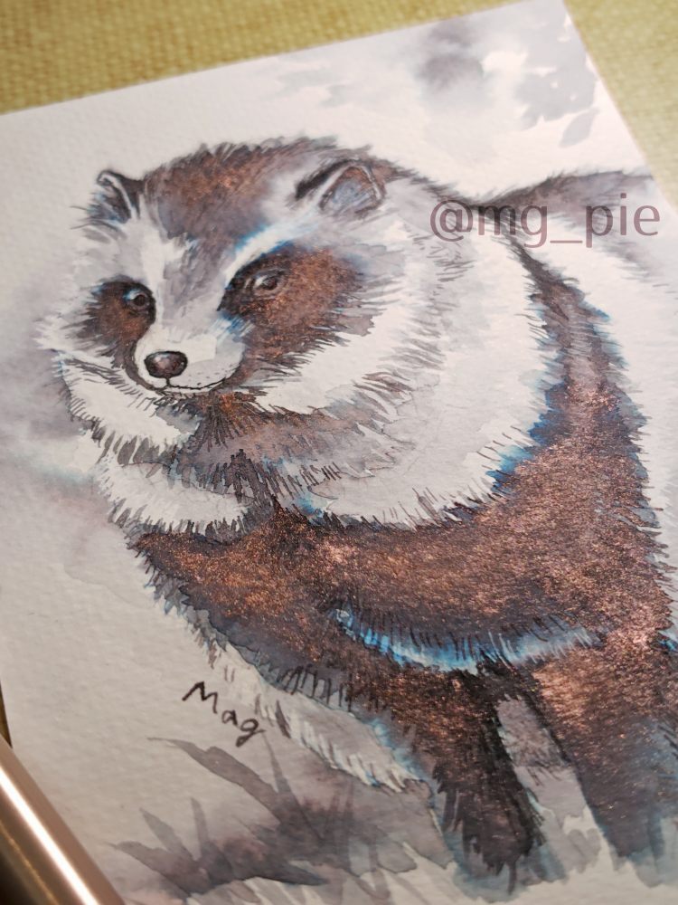 フェリスホイールプレスの新色「エンバーズ オブ タイム」(本日11/7(金)発売!)で描きました🦝 水でぼかすとピンク~水色まで出てくる色幅の広いグレーですが、ローズゴールドのラメに光が当たるとぐっと温かみが出ますね。晩秋らしい雰囲気になりました。 #ferriswheelpress #フェリスホイールプレス pic.x.com/UlnaCe3qBd