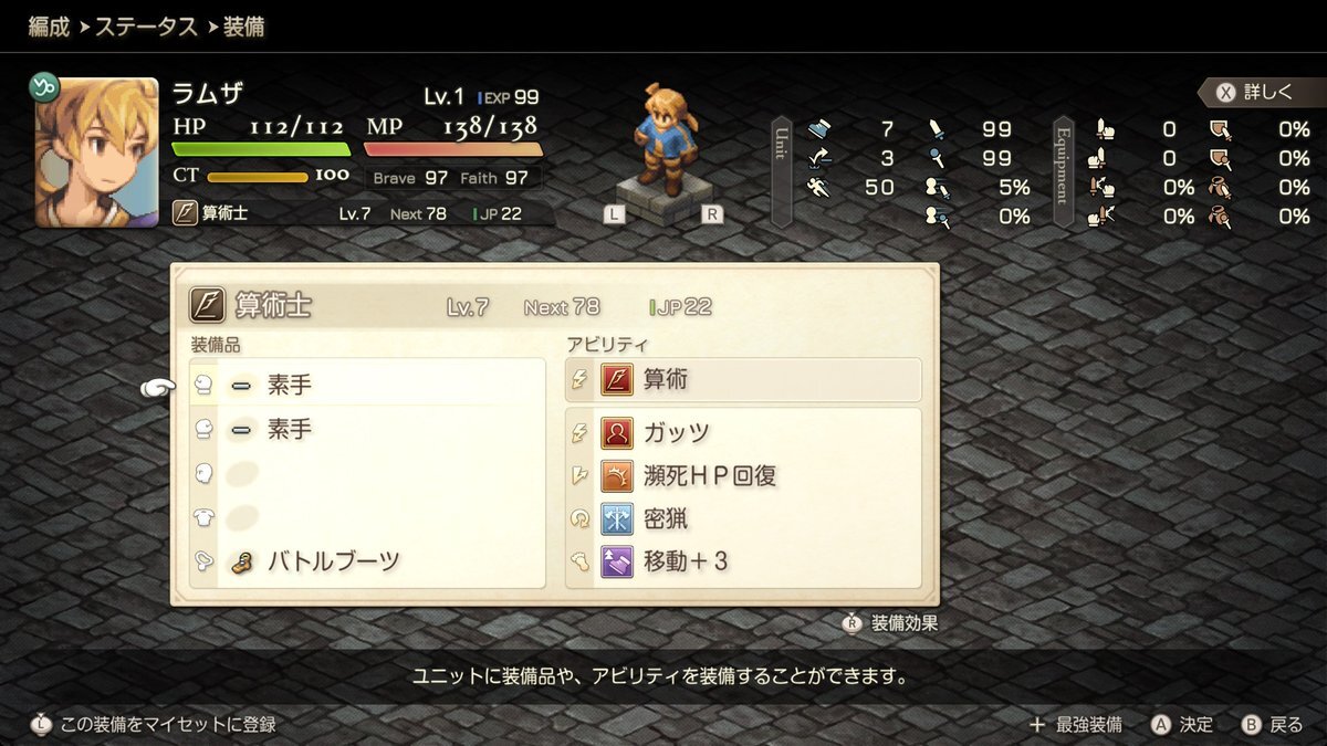 #FFT #FFタクティクス ついにレベル1の最強ラムザを育成できました! HPは理論値、MPもHPを犠牲にしなければ理論値 これ以上強いラムザは作成不可能能です これでようやく先に進める... シナリオはまだ砂ネズミの穴ぐらクリアしたばかり (続 pic.x.com/HikirJQ13D