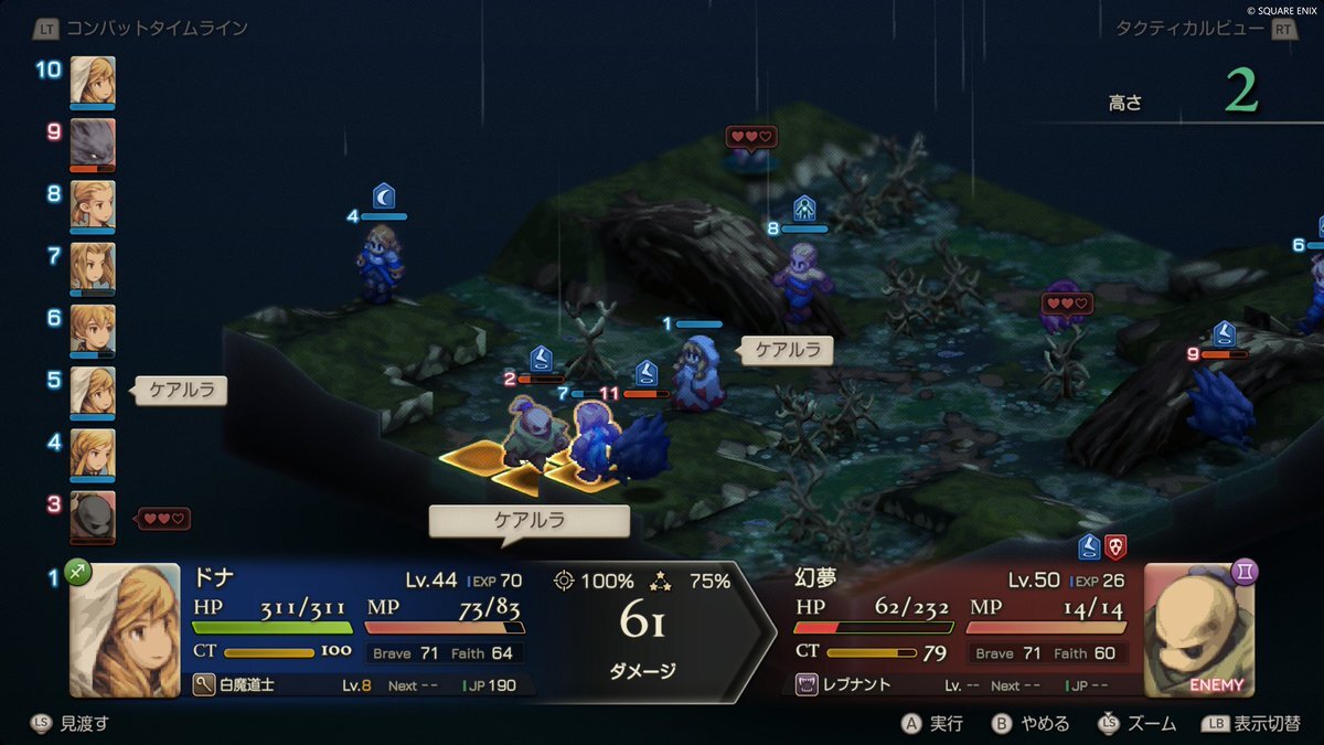 状態異常「アンデッド」のユニットは、一度倒した後、ハートがすべてなくなっても復活してしまうことがある。 アンデッドは、ポーションやアビリティ「ケアル」など、味方ユニットを回復する行動で攻撃することもできるので、効率的に倒していこう。 #FFタクティクス pic.x.com/CbneLiwk2P