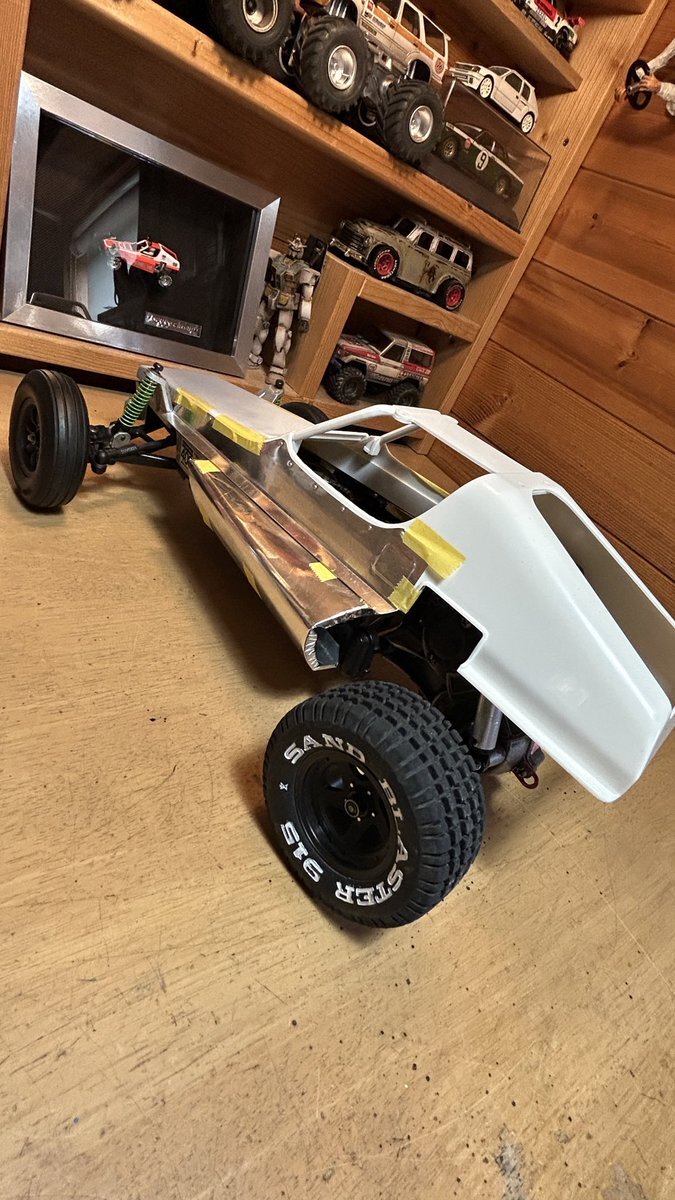 サイトポンツーン工作 牛乳パックの型紙から0.2厚アルミ板に切り出して、ペンチで折ってアイスの棒でコネコネしてます #バギーチャンプ #buggychamp #グラスホッパー #grasshopper #tamiyarc #ラジコン #tamiya #タミヤ pic.x.com/2TJZ795NgY