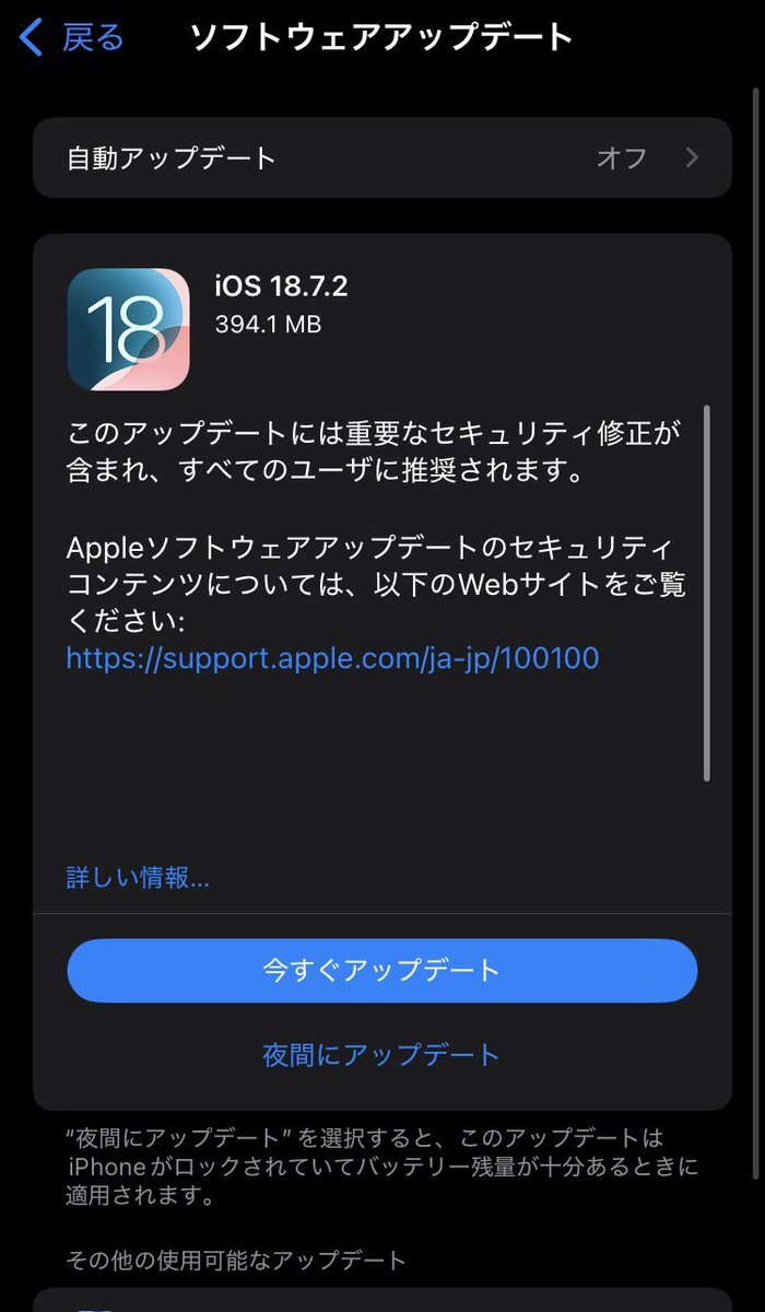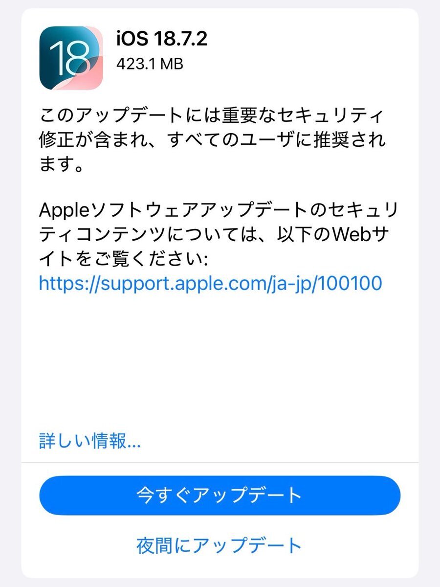 iOS18.7.2に気づいたが、、 今日リリースのアプリがあるので、セキュアアップデートなのは知ってても、暫くは見合わせたいと思ってる。。 #iOS1872 #iOS1871