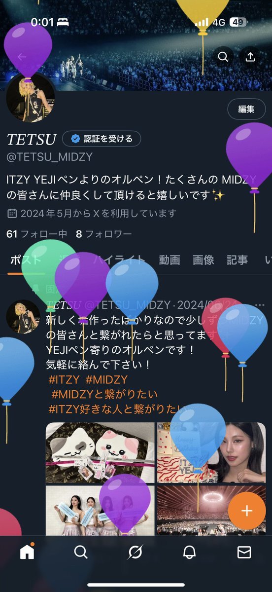 初のオタ垢!! 何から何まで全然わからんし、不安だらけやけどオタ活楽しみたい💕 ここではKISSOFLIFEで主に活動したいけどITZYもIVEもルセラも好きだからイベント行くってなったら色々活動したいなぁ。 #KISSOFLIFE好きな人と繋がりたい #KISSYと繋がりたい #ITZY好きな人と繋がりたい