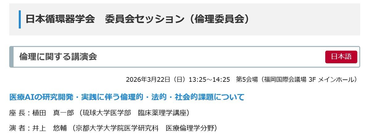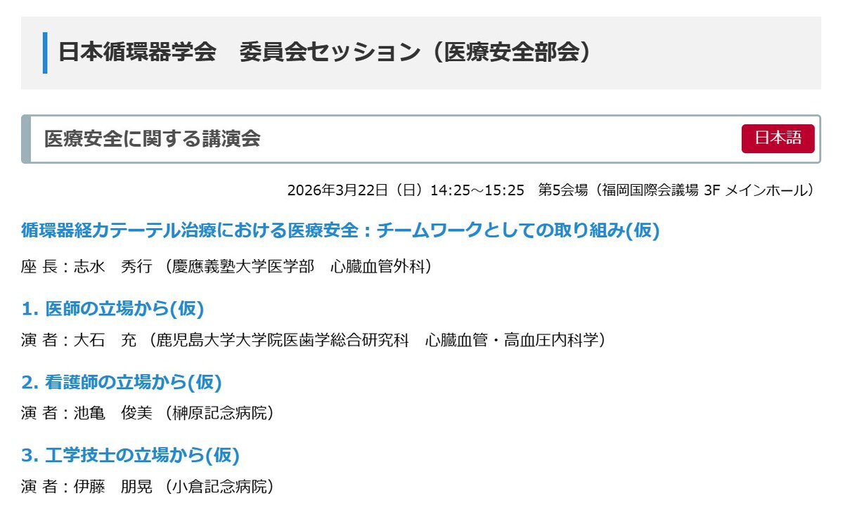 日本循環器学会からのお知らせ 第90回学術集会の医療安全・倫理に関する講演会のご案内が掲載されましゅた‼ 下記URLよりご確認下しゅわぃm(*'8'*)mペコリッ✨ congre.co.jp/jcs2026/lectur… #日循 #JCS #26JCS pic.x.com/CxhnBuAQYT