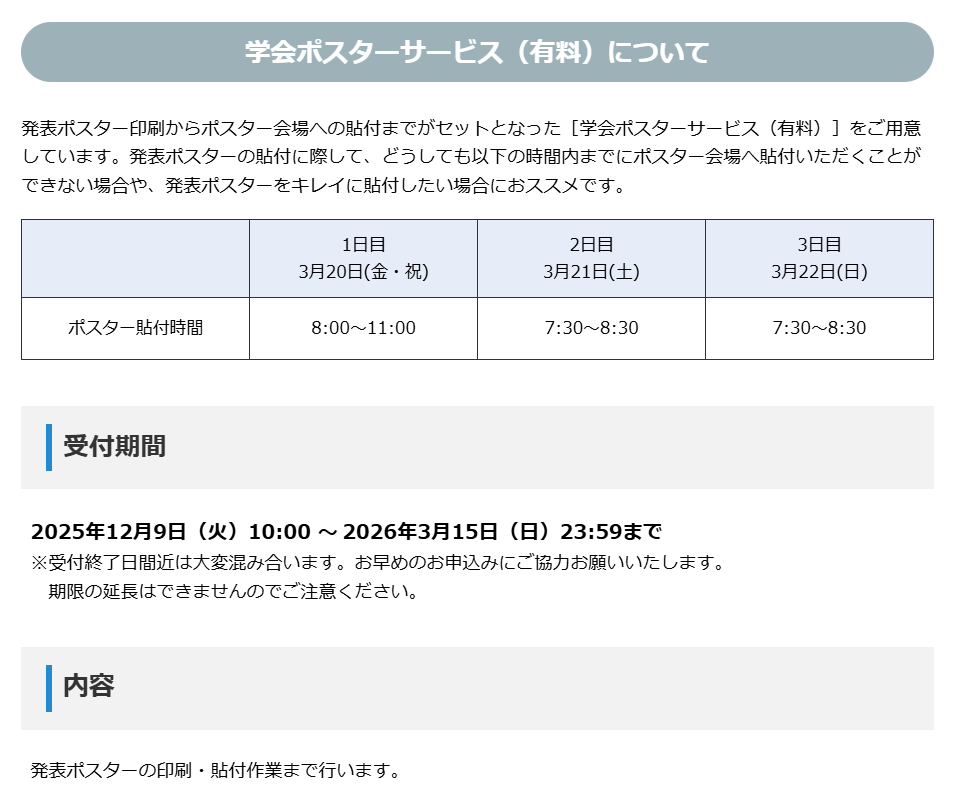 日本循環器学会から第90回学術集会に関するお知らせ (*'8'*)ノ✨発表ポスター印刷からポスター会場への貼付までがセットとなった[学会ポスターサービス(有料)]をご用意していましゅ。 詳細は下記URLよりご確認下しゅわい‼ congre.co.jp/jcs2026/printi… #日循 #JCS #26JCS pic.x.com/O8pUzPpAJE