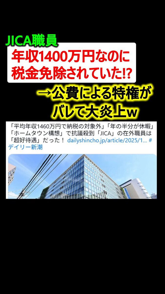 キーっ💢😡 許せん❗️ 知ってた❓ もう解体しよう‼️ リツイートお願いします🙇♀️ #JICA解体 #JICAとNAGOMiと東亜総研は利権の巣窟 #JICAも公金泥棒組織 JICA職員 年収1400万円なのに💢 なぜか税金免除と判明🔥 →特権がバレて炎上 youtube.com/shorts/c231Mcp… @YouTubeより