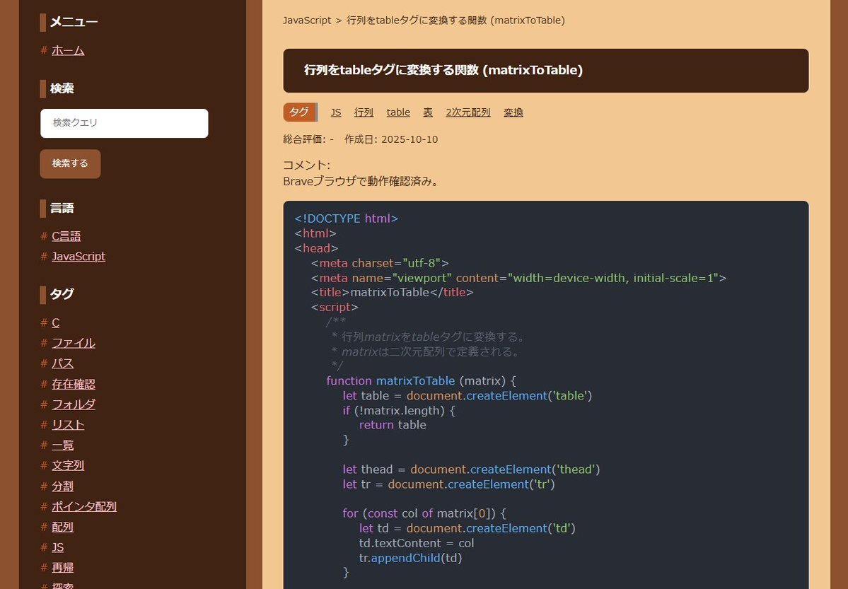 JavaScriptで行列(2次元配列)をtableタグに変換する関数 (matrixToTable)をスニペットとして書きました。 tncnk.com/snipettan/inde… #JS #JavaScript #コードスニペット #関数 #行列 #スニペット #変換 #テーブル #表 pic.x.com/kWJNvLp8qZ