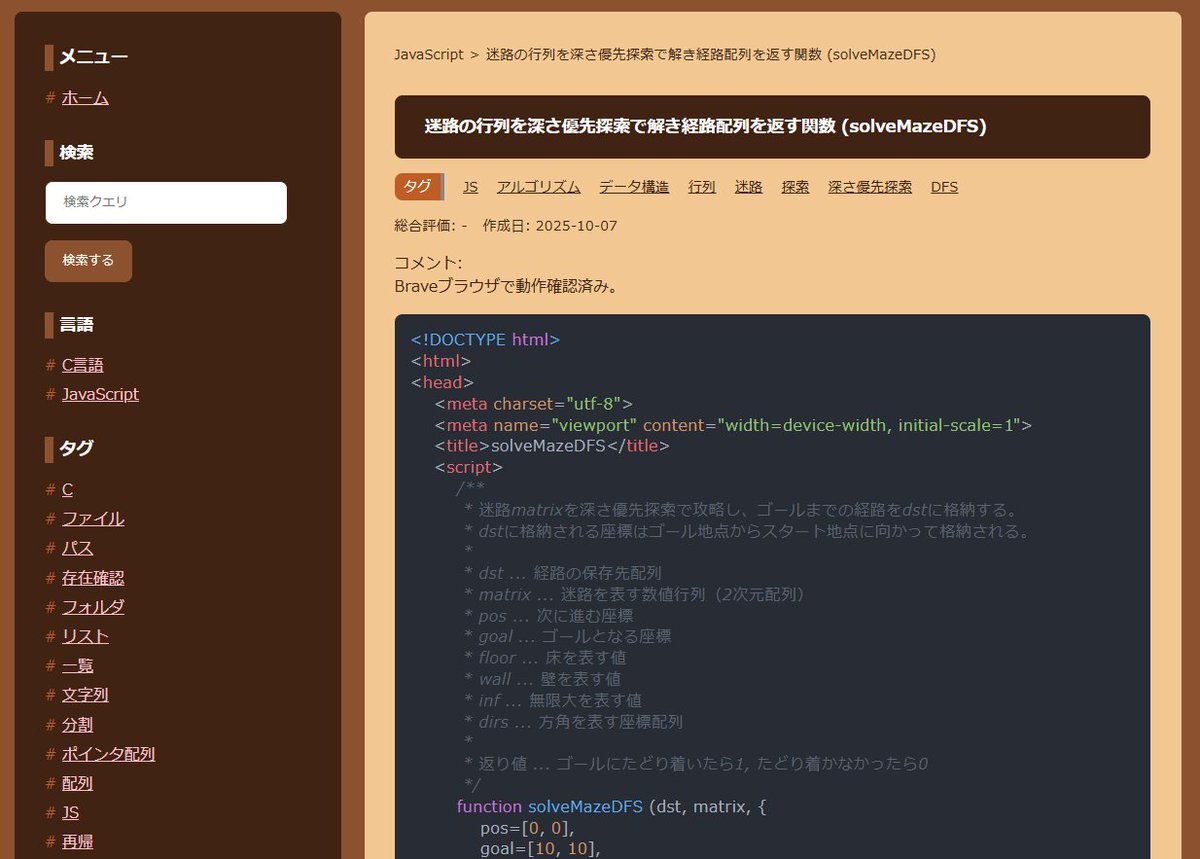 JavaScriptで迷路の行列を深さ優先探索で解き経路配列を返す関数 (solveMazeDFS)をスニペットとして書きました。 tncnk.com/snipettan/inde… #コードスニペット #JS #JavaScript #ライブラリ #関数 #OSS pic.x.com/Y9B3nTGsZZ