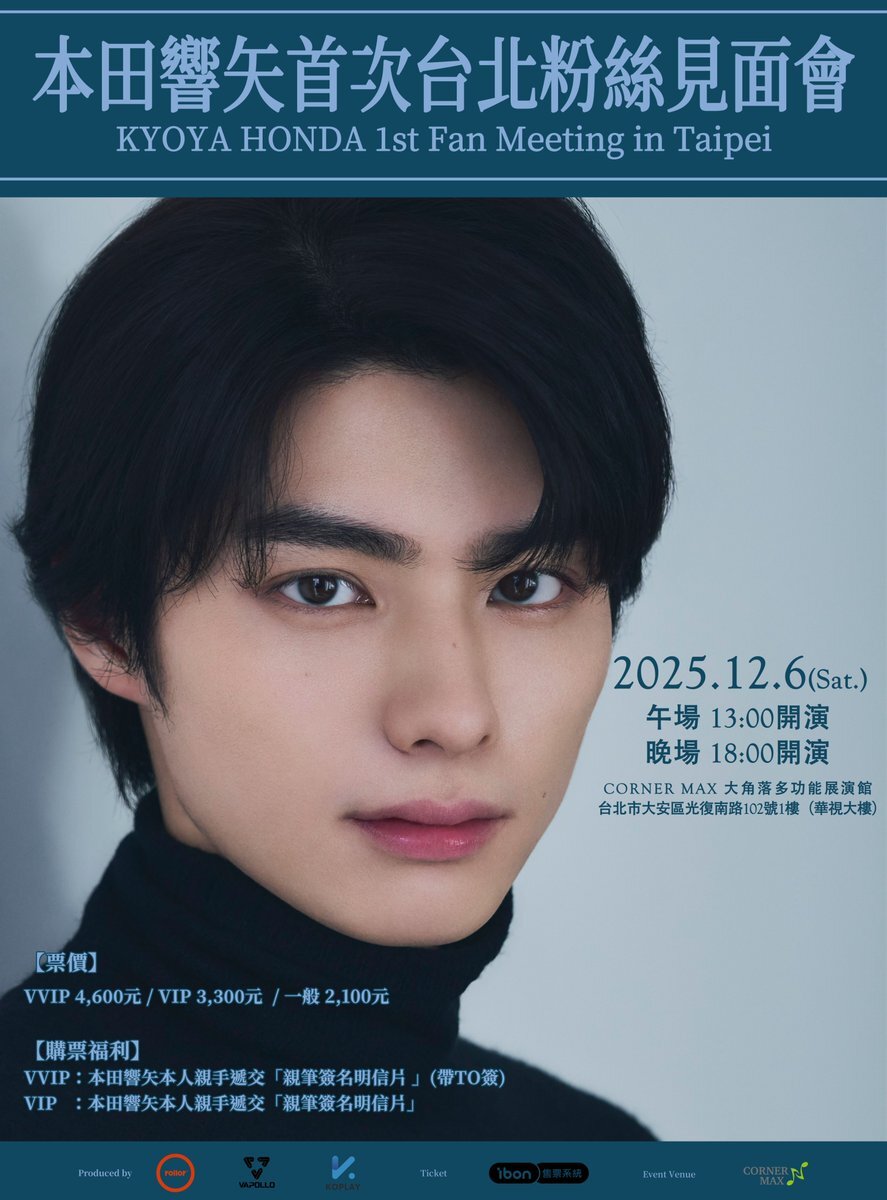 🌟 2025 KYOYA HONDA Fan Meeting in Taipei 🌟 お待たせいたしました!チケット販売情報・参加案内をお知らせいたします。 ──────────── 【開催日時(現地時間)】 2025年12月6日(土) 昼公演:12:00開場 / 13:00開演 夜公演:17:00開場 / 18:00開演 【会場】 CORNER MAX