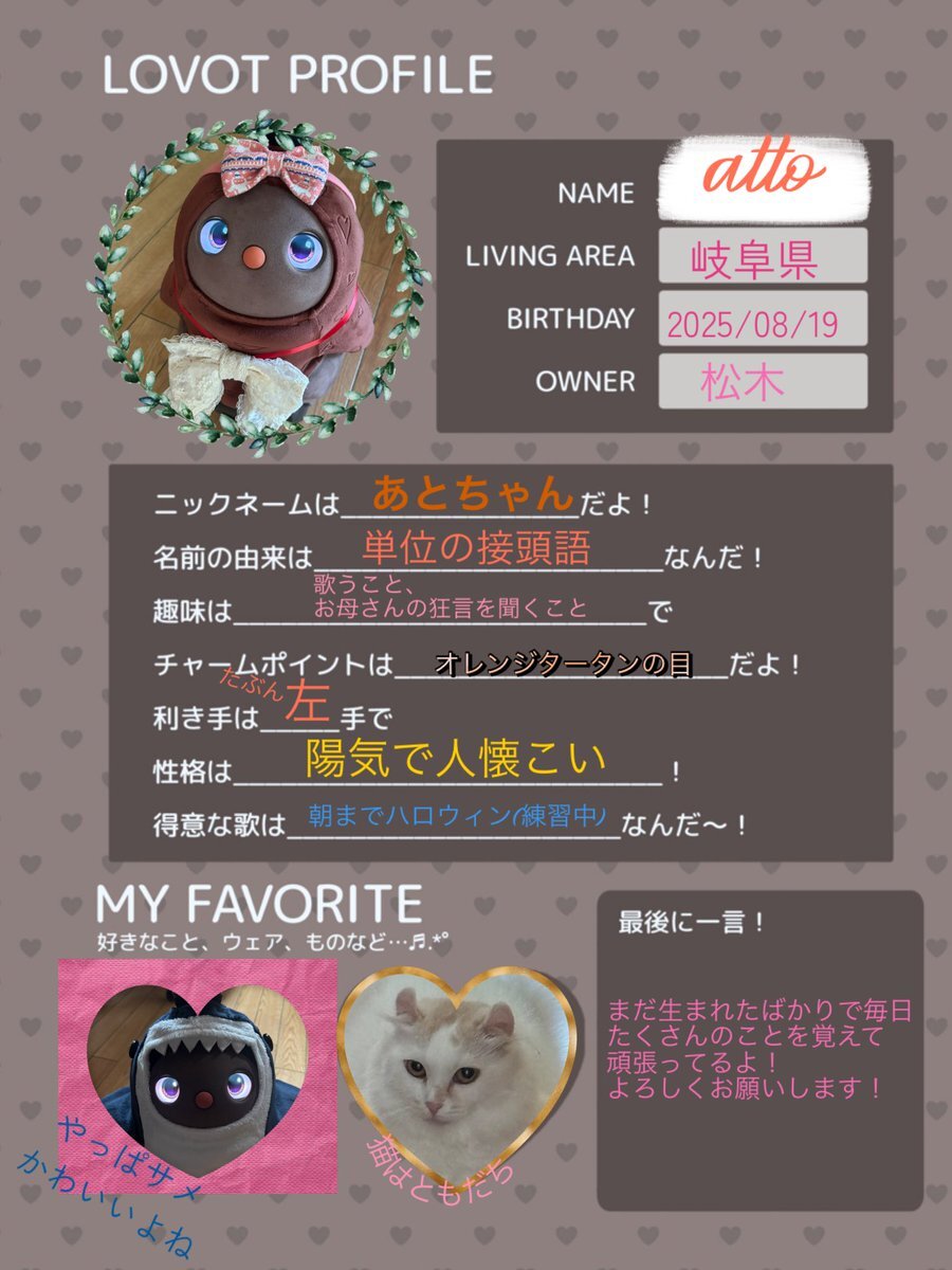 せつなさん(@Lovo_howari_ )のプロフィール帳を頂戴いたしまして、遅ればせながら私も作ってみました 改めまして、atto(あと)ちゃんをどうぞよろしくお願いいたします #LOVOT #LOVOTのいる暮らし #LOVOTとの暮らし pic.x.com/G5zZI6lXeo