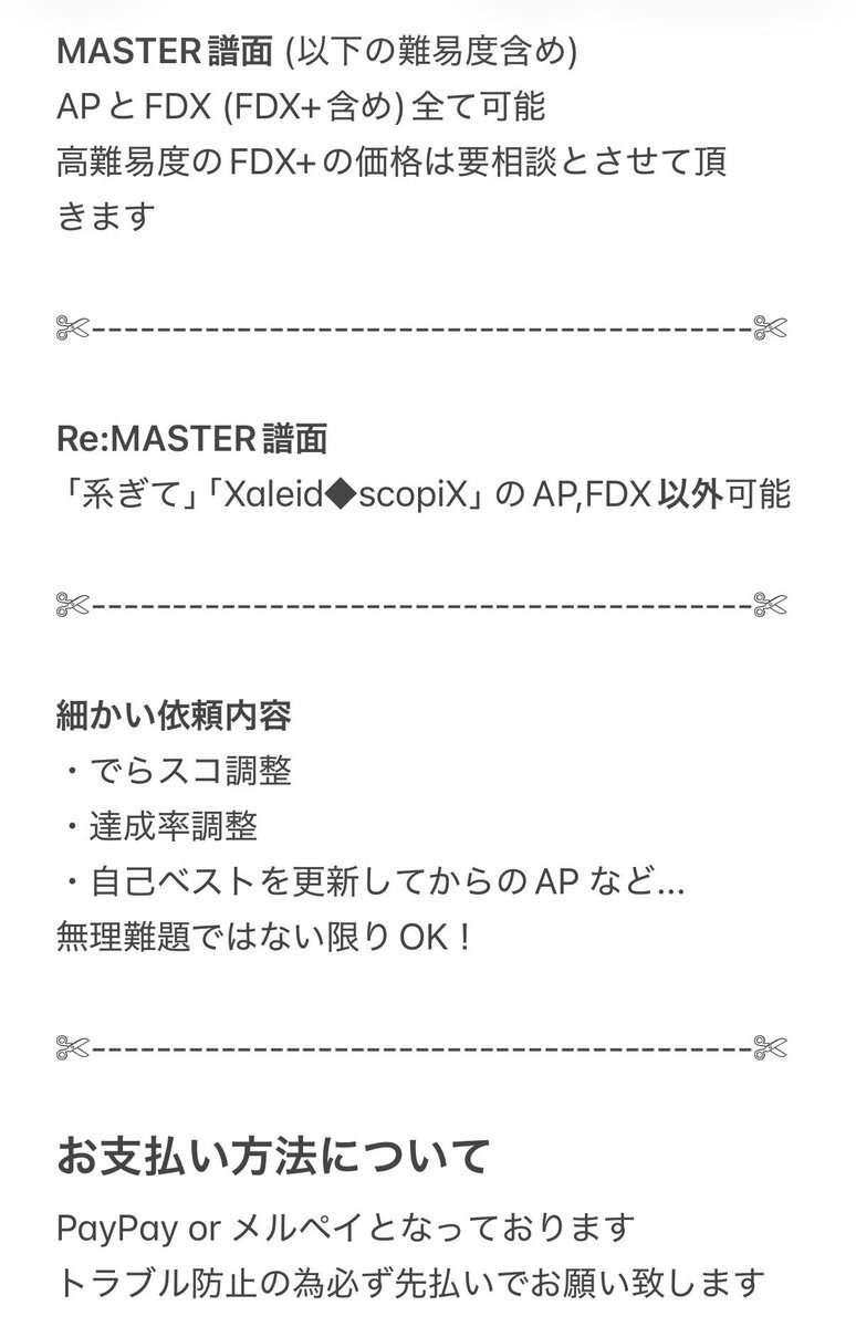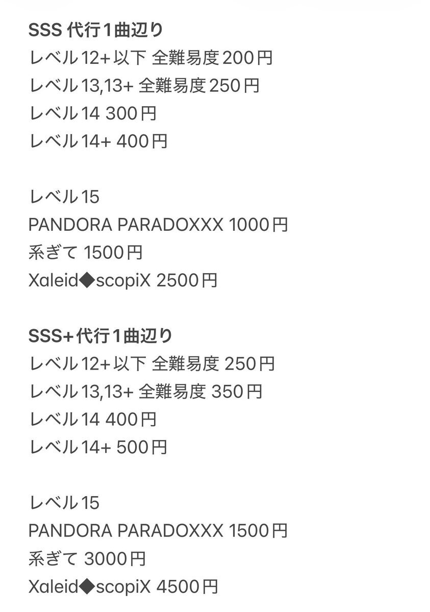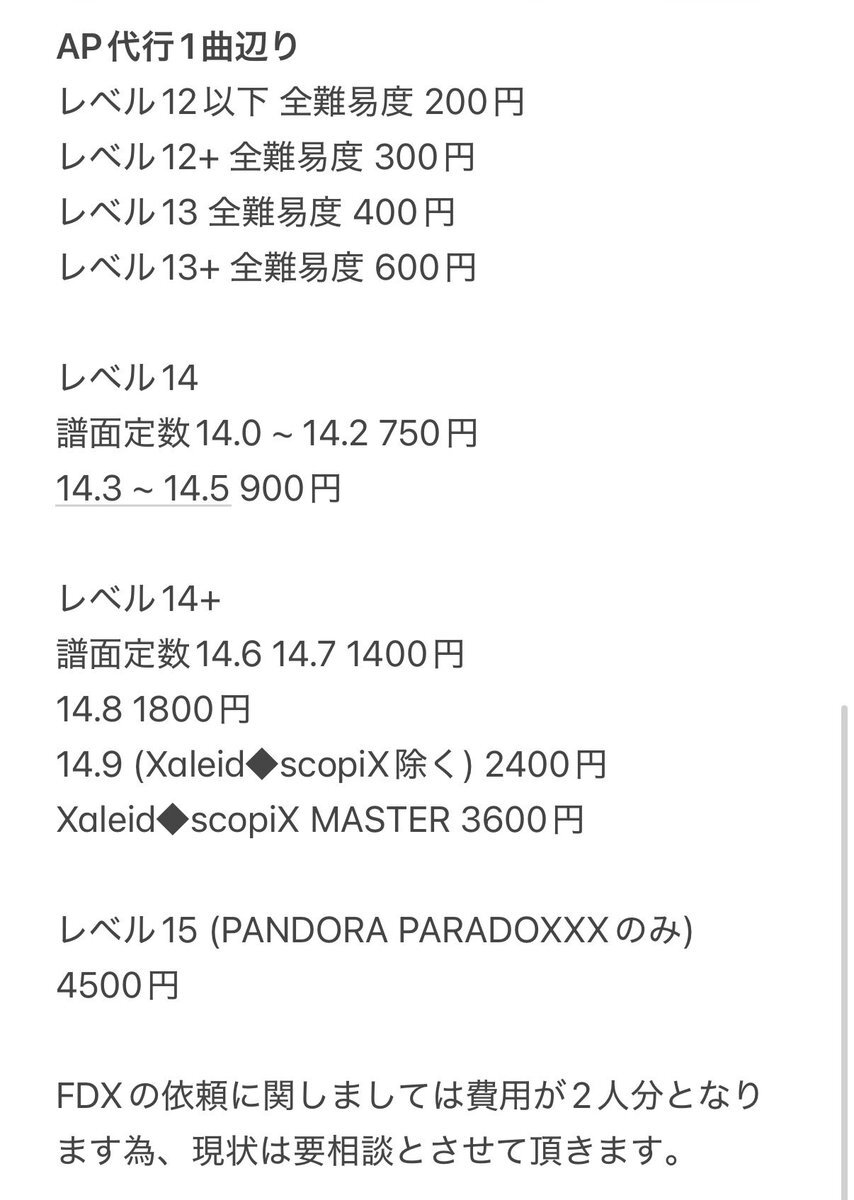 現在の代行価格はこちらとなっております (12/4現在) ご相談だけでも大歓迎です! まずはDMだけでも頂けると幸いです! 是非ご検討お願い致します! #maimai #maimaiでらっくす #maimai代行 pic.x.com/Pc50vPxozQ