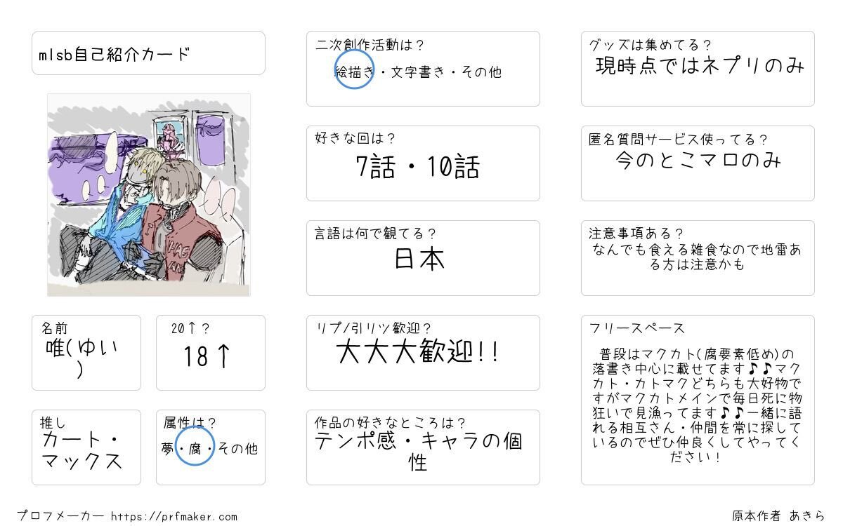 mlsb自己紹介カード ❤️💬♻️全反応巡回💪 ※プロフに成人済み、📺🦾好きならフォロバ率高いです🫶 prfmaker.com/p/90df348fb25a… #mlsb好きさんと繋がろう #マクカト好きさんと繋がりたい
