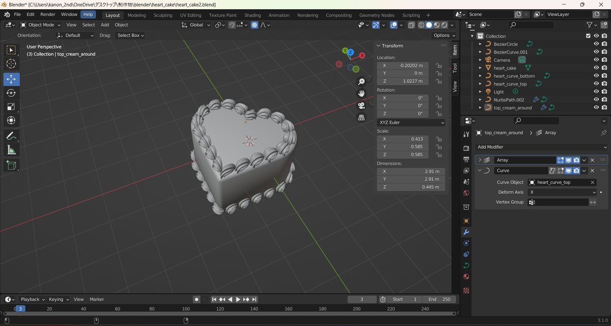 めっちゃ不慣れだけど、クリームをベジェ曲線使って作って、alineとcurveのモディファイヤーを使ってざっくり配置してみた! もっと自動で綺麗に並んでほしいけど、やっぱり手直しは必要かなあ #blender #modeling #kanonblenderlabo