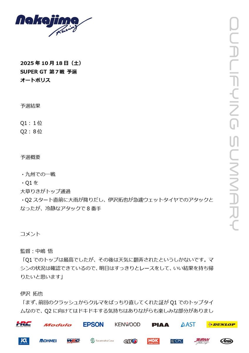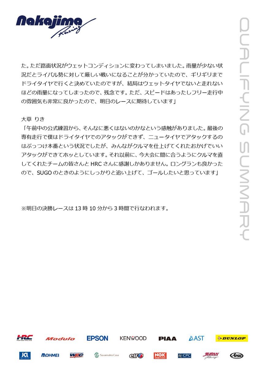 予選レポートです🗒️ 明日の決勝レースは13時10分から3時間で行なわれます🏁 #nakajimaracing #modulo #SUPERGT #Modulo64 pic.x.com/XDZxn4yZiv