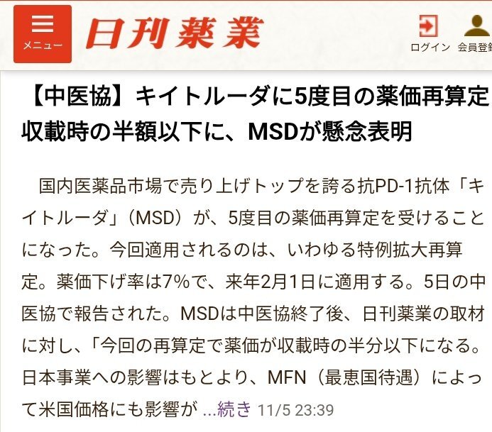 #キイトルーダ #MSD #初収載時の薬価の半額に #抗がん剤 #キイトルーダ薬価切り下げ 新薬価は来年2月からの保険適用。 新薬価を年内に決定。本年の7%切り下げに。 高薬価抗がん剤『キイトルーダ』の保険薬価。 pic.x.com/wjCNdbwPTL