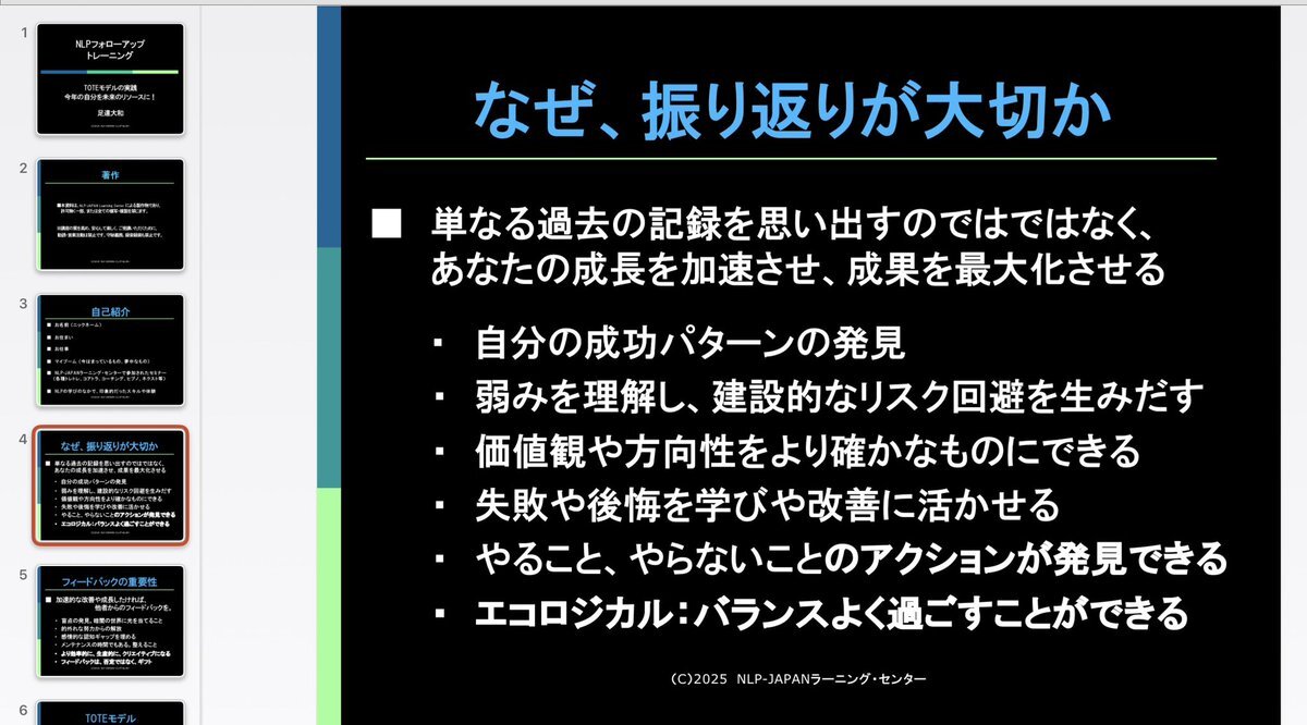 NLP−JAPANラーニング・センターの生徒さん対象のフォローアップ勉強会でした。少し早い「今年の振り返り」がテーマでしたが、 お声としては、 NLPの学び直しはもちろん、「振り返り」の重要性が自覚でき、何を振り返るのか、その視点が手に入ったとのこと。 視点、大切ですね。 #NLP pic.x.com/8dSh0iLkHp