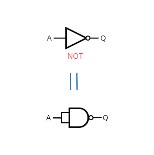#論理回路学_NAND構成編 10 Q. #NOT ゲート単体を #NAND のみで構成しよう A. NANDゲートの2つの入力に 同じ入力値Aを入力すればよい。 そうすれば,出力値Qについて… Q=A nand A =¬(A and A) =¬A #真理値表 は A Q 0 1 1 0 pic.x.com/2PPwm3oocQ
