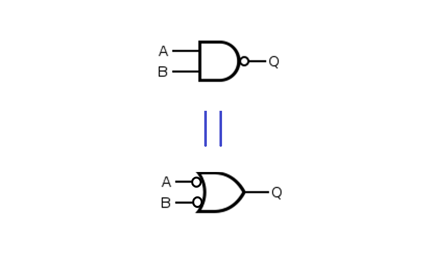 #論理回路学_NAND構成編 8 Q. 前ツイの結果を使って #OR ゲート単体を #NAND と #NOT のみの組み合わせに変換しよう A. ORの前にNOTを出現させれば NOTとORをセットにして NANDに置換できる。 そのために ORの前にある各入力を #二重否定 すればよい。 pic.x.com/H4OXk0Y8Eo