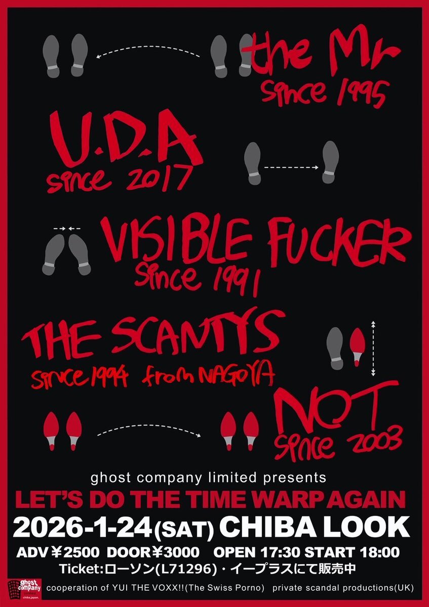 2026.01.24.(sat) ghost company limited presents LET’S DO THE TIME WARP AGAIN @CHIBALOOK #VisibleFucker #TheScantys 名古屋 #UDA #NOT #theMr 17:30/18:00 A¥2500/D¥3000(共に+1D) 【前売り】 ローソンチケット イープラス(Lコード71296) 千葉LOOK店頭のみ☎️✖️ ご予約は出演バンドDMリプにて pic.x.com/XAEcNB6WR2