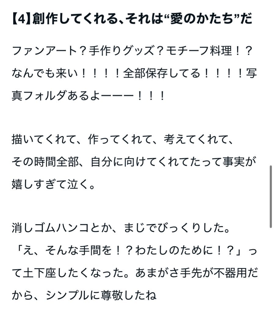 note初投稿で書いてみたよ 記事にいいねつけたら、その人に向けたコメントが載せられるっていうから、みんなに思ってることかいたんご わいはこの推され方すき!をまとめました 【厳選5つ】推し目線で嬉しい推し活とは?全力で愛を叫ぶにも手段があるだろ❗️|あまがさ深海 note.com/amagasa_mimi/n…