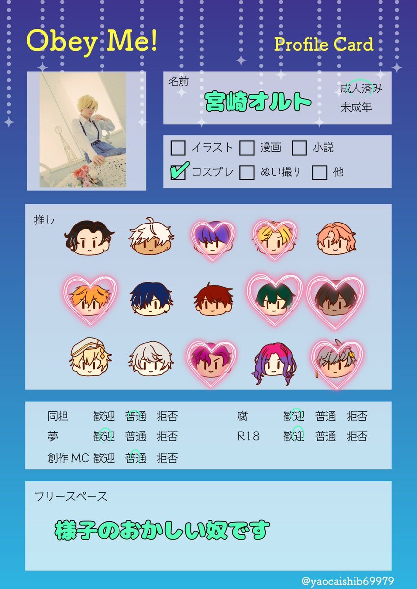 素敵なテンプレお借りしました✨ コスプレメインです🙌🙌 全反応気になった方々ゆっくりですが無言フォロー失礼します😈🤲 #おべいみー好きさんと繋がりたい #ObeyMe好きさんと繋がりたい #自己紹介テンプレート pic.x.com/oHeMdL9fxg