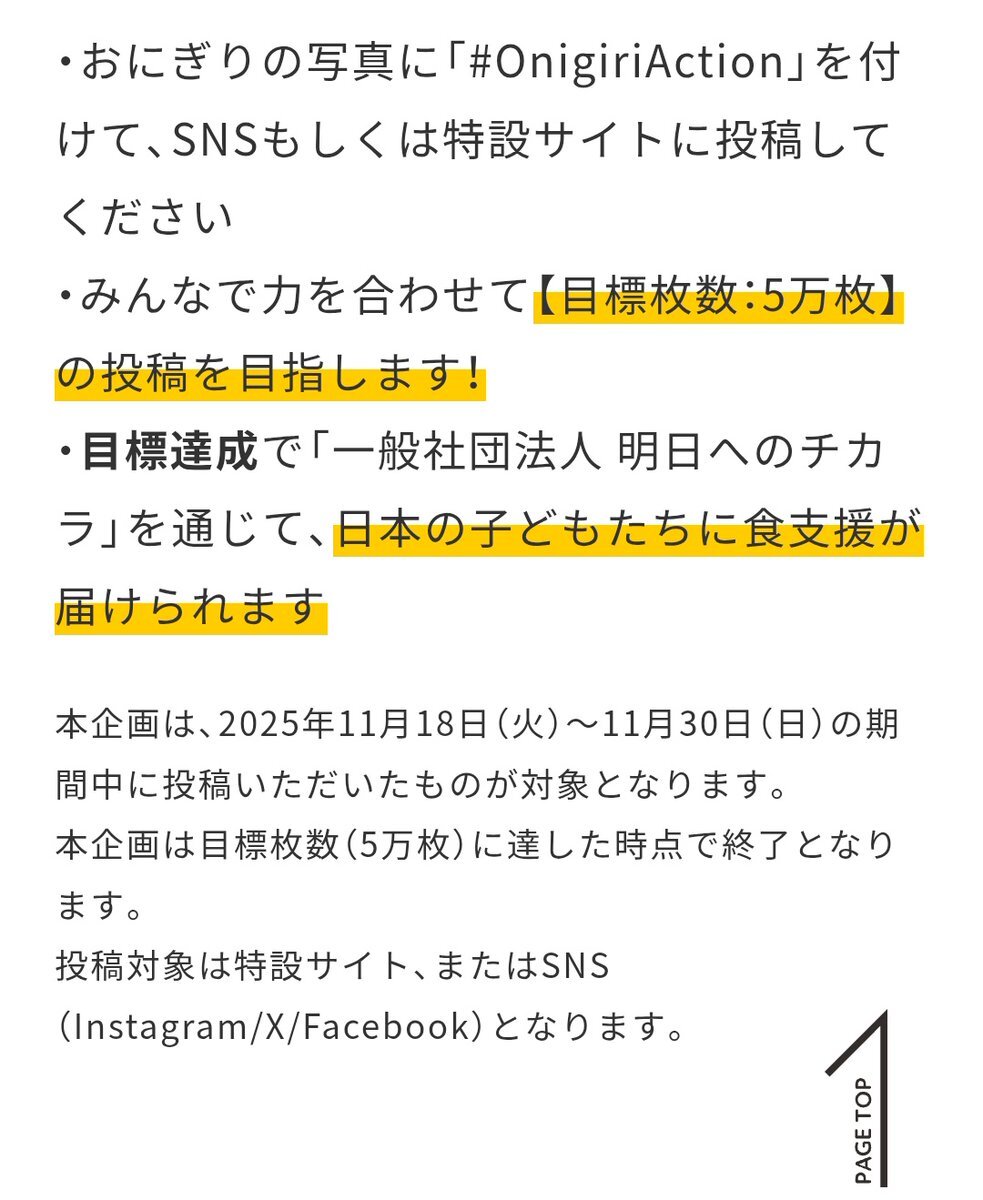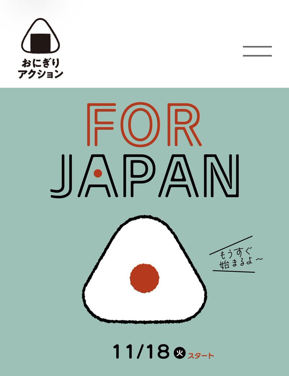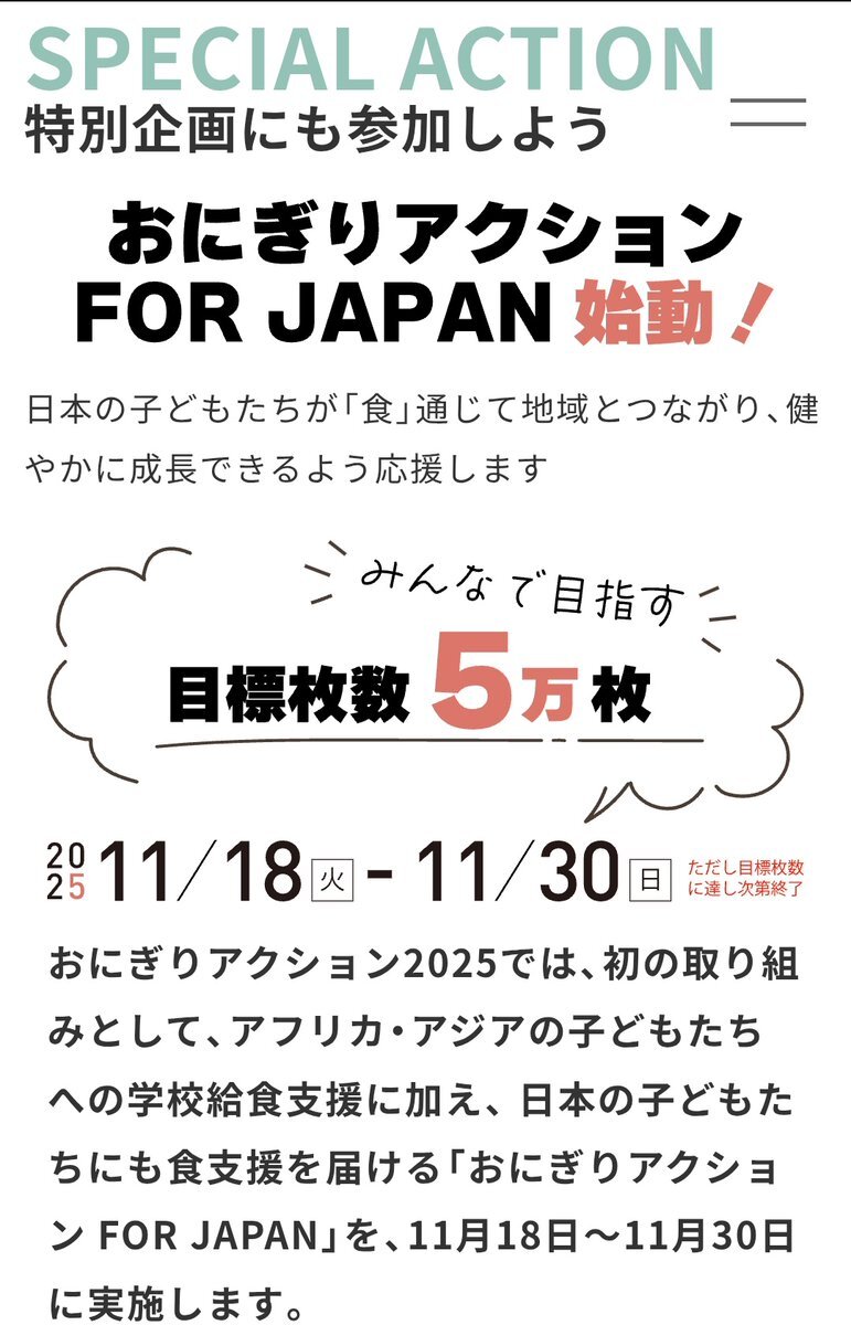 11月18日からは、日本の子どもたちを支援する、 特別企画「おにぎりアクションFOR JAPAN」が開催。 ・おにぎりの写真に「#OnigiriAction」を付ける 協賛に住友重工さんやニッスイさん、日産セレナさん等 onigiri-action.com 18日からです~😺🍙🍙🍙