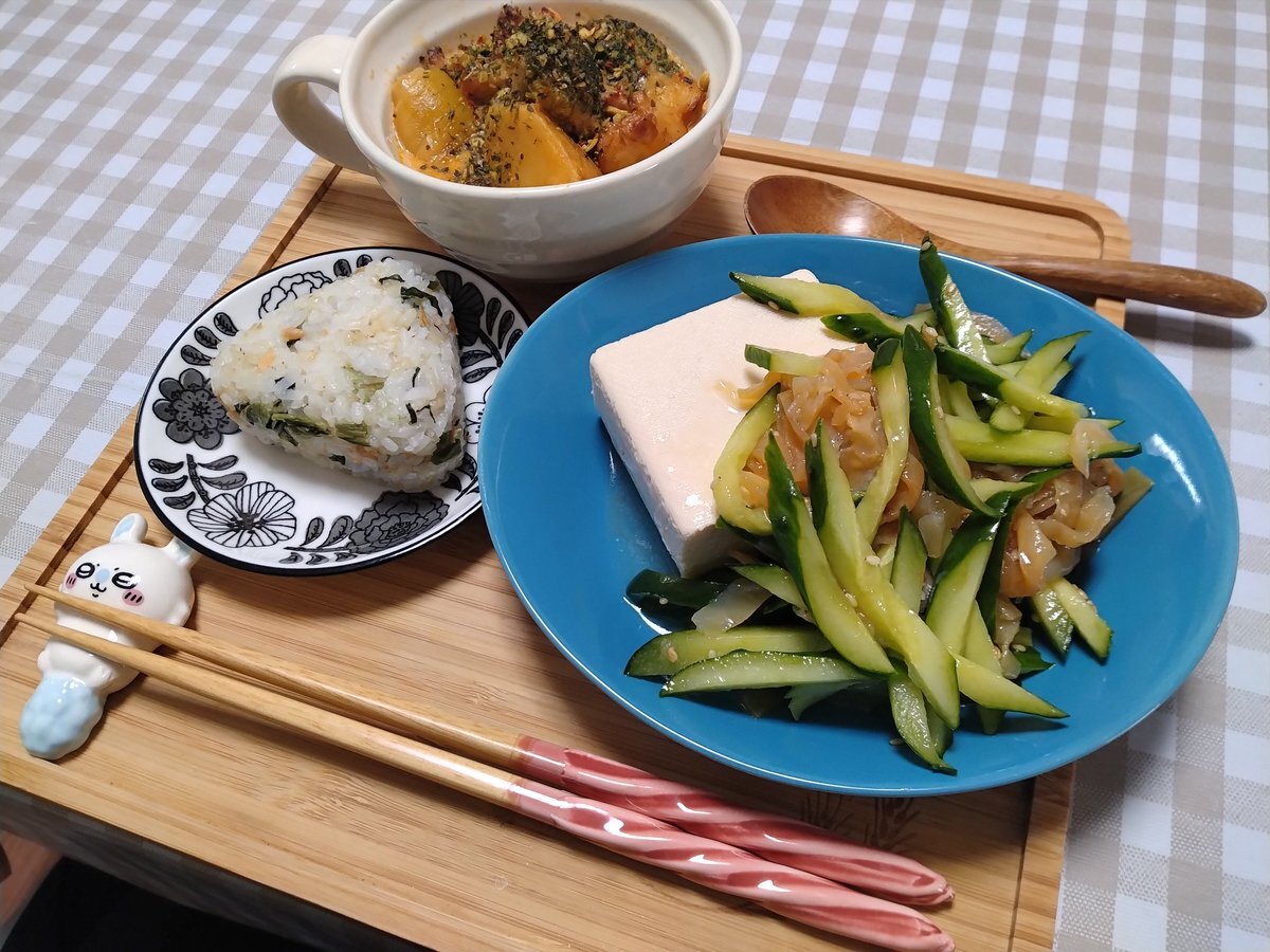お昼ごはんよー 中華くらげときゅうりの和え物 木綿豆腐 チキンカチャトーラ 鮭と広島菜の玄米入りおにぎり #OnigiriAction おにぎりアクションはきょうまでかな? 中華くらげとチキンカチャトーラは一昨日の晩の残り物、木綿豆腐は賞味期限切れ2日なのでおなかにしまいますよ 516kcal pic.x.com/8yIM4e47Ll