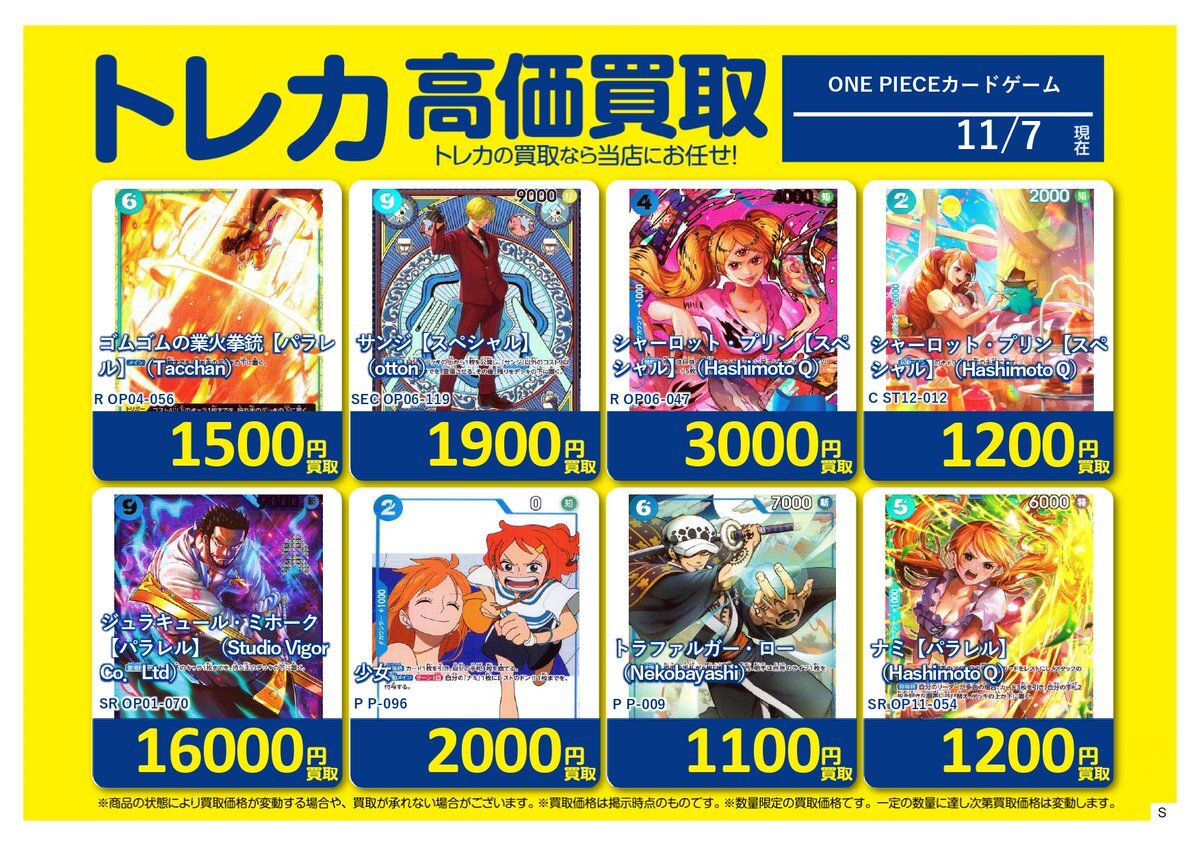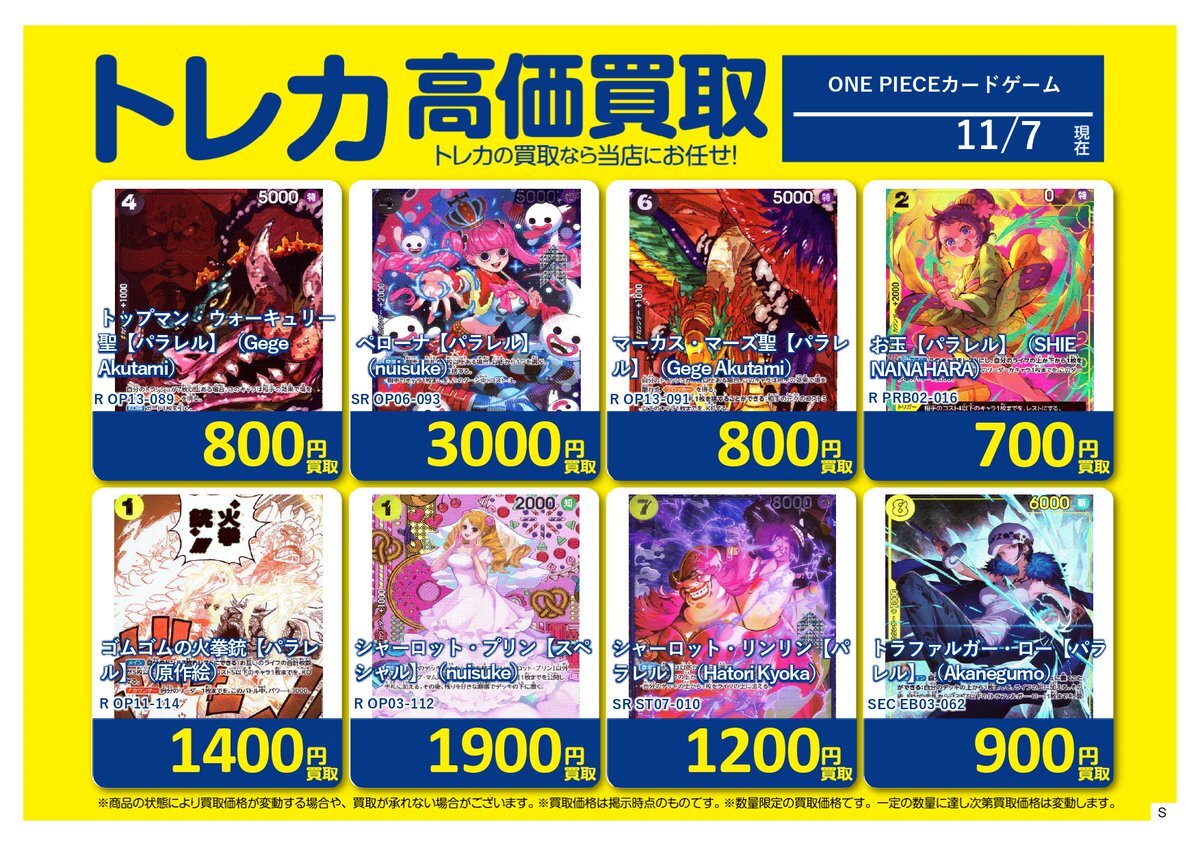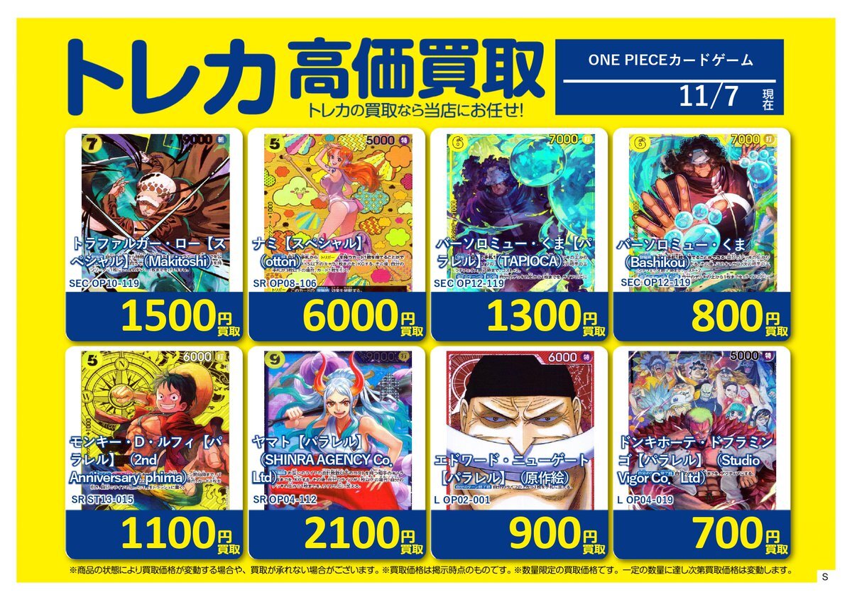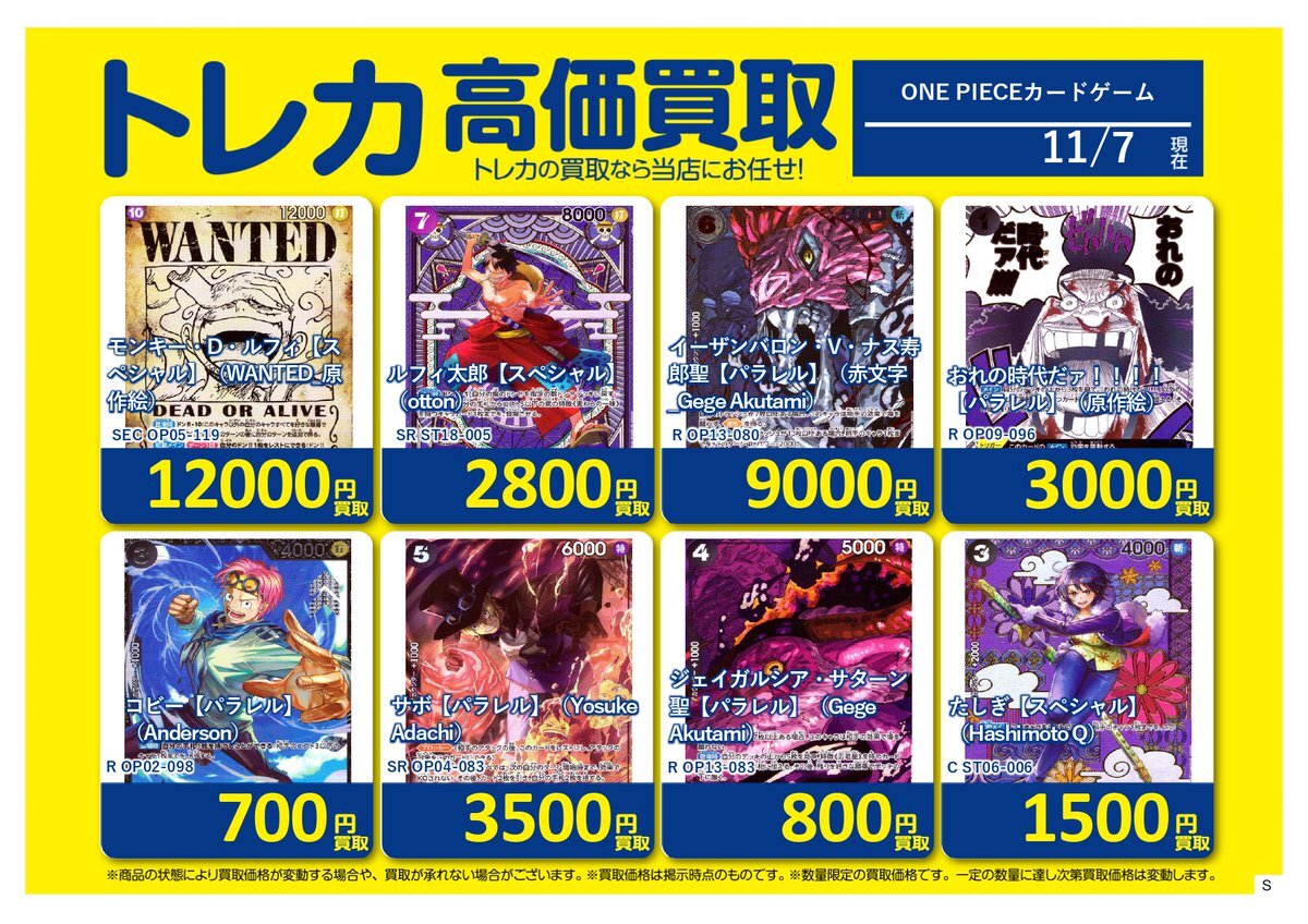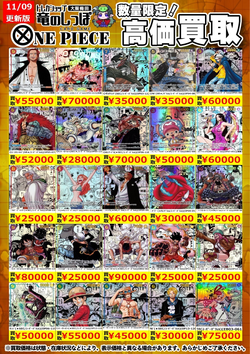 【高価買取情報 #OP】#梅田しっぽのOP買取表 11/8(土) 開店時~ 数量限定・美品での買取価格となります☑ ※相場変動により、予告なく終了または表示価格の適用外となる場合がございます。 pic.x.com/fY6O9kqoz7