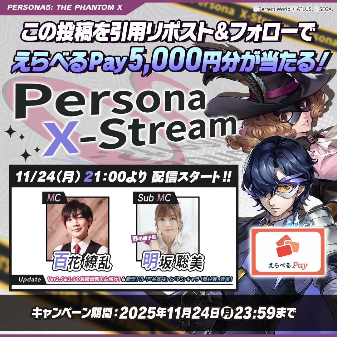 / この投稿をフォロー&引用リポストで 5,000円分のえらべるPayが5名様に当たる! \ ✧ː────⸜ 配信決定 ⸝‍────ː✧  Persona X-Stream ver.2.5 & 2.6         11/24(月)21:00~ ✧ː──────────────ː✧ アトラス公式YouTubeで今すぐ視聴予約👇
